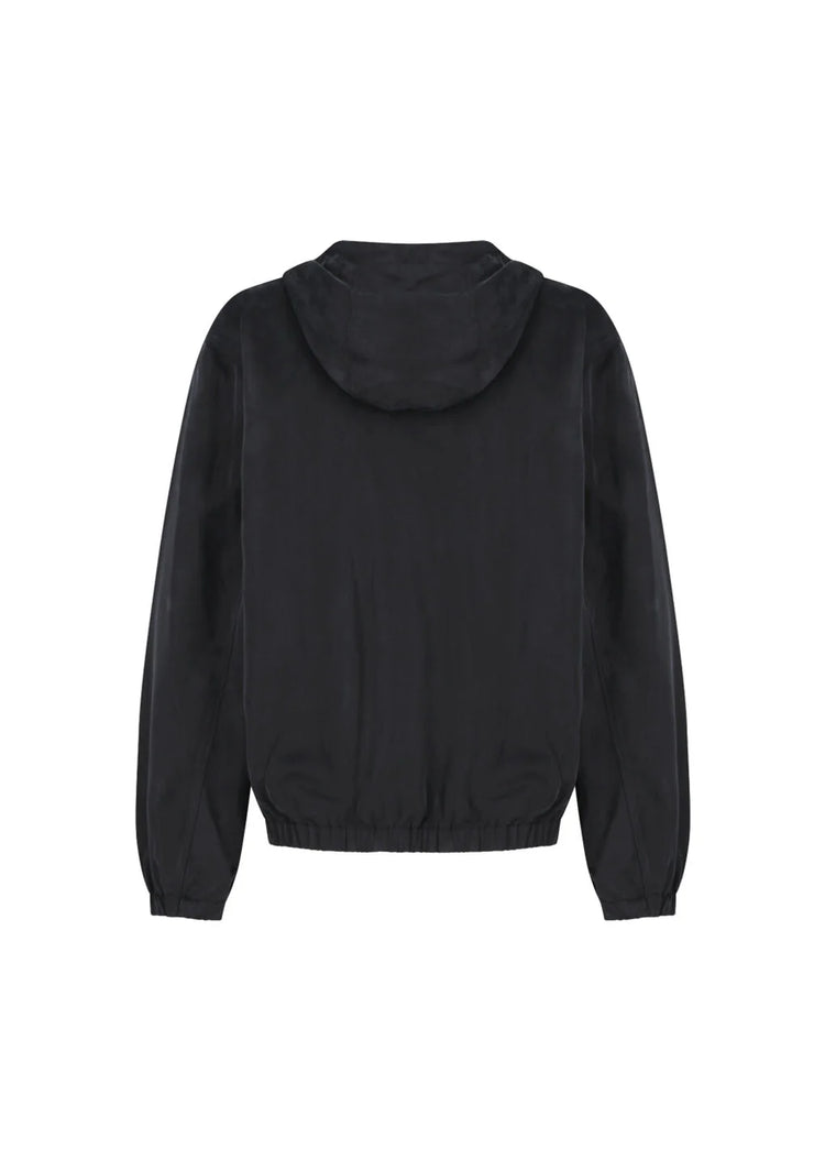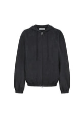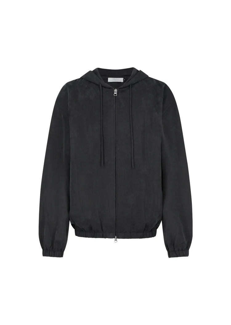 柔らかく上品な光沢のキュプラフードジップアップジャンパー。