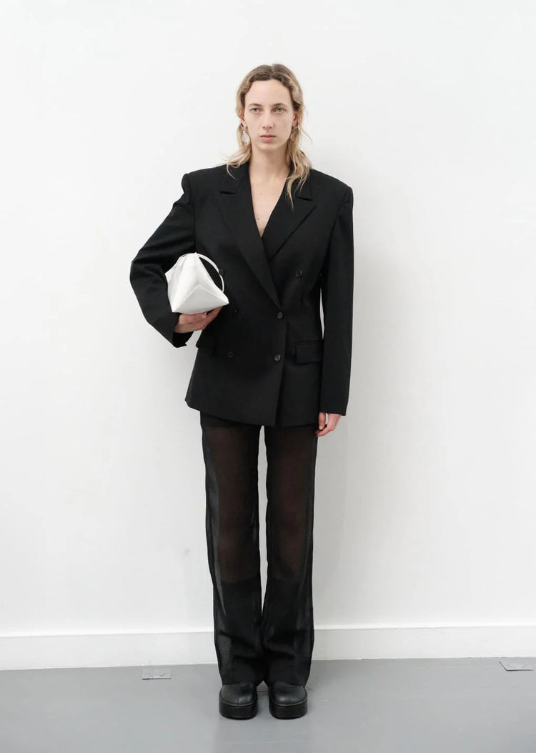 ほのかな透け感のあるシアー素材で仕立てたストレートフィットパンツ。 ハーフパンツ丈の裏地を重ねることで、軽やかで気軽に着用できるデザインです。 バックポケットの装飾ディテールを加え、クラシックな雰囲気を演出しました。 ミニマルなシルエットと軽やかな素材感が絶妙に調和し、単独での着用はもちろん、 ドレスやスカートとレイヤードすることで、より洗練されたスタイリングを楽しめます。