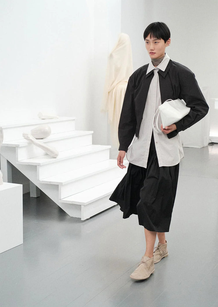 異素材の配色が際立つ、感覚的なディテールのキュロットパンツ。 膝下までの丈感で、スカートのように見えるデザインが特徴です。 動きやすさとエレガントなシルエットを兼ね備えた一着です。 ウエストラインには両サイドにダーツを入れ、スリムで洗練された印象に。 切り替え部分にはたっぷりとギャザーを施し、裾に向かって広がるフレアシルエットが優雅なムードを演出します。 サイドファスナーとフック仕様で、着脱もスムーズ。 カジュアルながらもフェミニンな雰囲気を楽しめる魅力的なアイテムです。