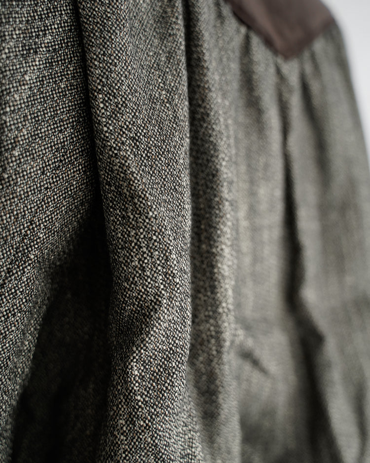 カジュアルなシルエットとミックスされたカラー感が魅力的なウール混紡素材でユニークなムードを提供します。 ハイネックカラーとVラインヨークライン下のシャーリングディテール、ラグラン袖でおしゃれなデザインを完成させ、袖と裾の細かいシャーリングで自然なボリューム感を強調します。 ツーウェイファスナーとバンディング処理された後、裾のボタン、ビジョ装飾で様々なシルエットが演出できます。