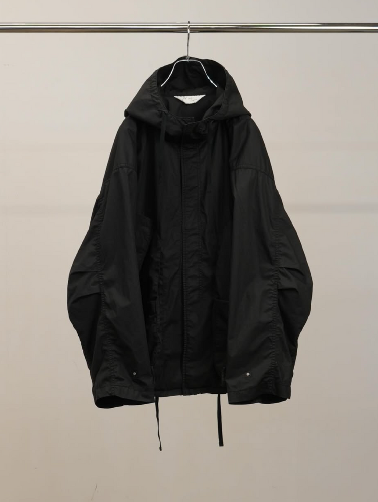 無機質なハリと艶を持つ、コットンのハイカウントタイプライターで仕立てたフィールドパーカー。
