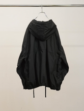 フーディネックは高めの設計で、上部だけボタンを留めてAラインを作っても良し、開くと衿として綺麗に広がります。首元と裾に備え付けたドローコードを引くとクシャっと縮み、シルエットに変化をもたらします。