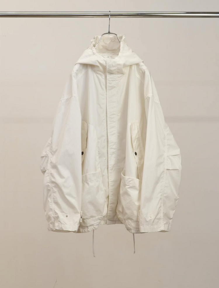 無機質なハリと艶を持つ、コットンのハイカウントタイプライターで仕立てたフィールドパーカー。