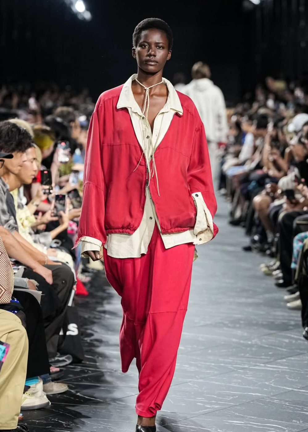 少しだけオープンカラーに寄せた衿元が春夏らしい開きを見せ、ポケットとカフスにはアクセントにギボシのボタンを採用しました。
