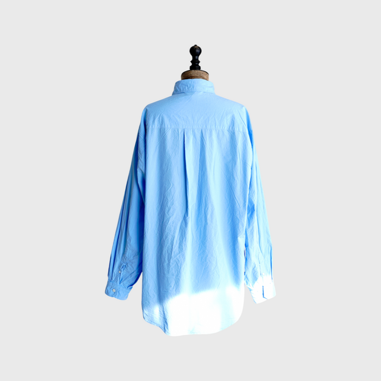 ANCELLMで毎シーズン定番で展開しているゆったりとしたシャツです。素材は近江の地で培われた技術で生機をゆっくり時間をかけもみほぐし、フィニッシュで更に手を加える事で生地の膨らみが出てナチュラルなシボ形状が現れる事で、 独特なタッチになり、風合いが増してきます。その素材を活かしつつ、オリジナルのカラーでシャツを染め上げました。さらに風合いが増し、雰囲気のある1着に仕上がりました。シルエットは身幅、肩幅など寸法を調整し、 カッティング、背中のドレープなどオーバーサイズでありながら、