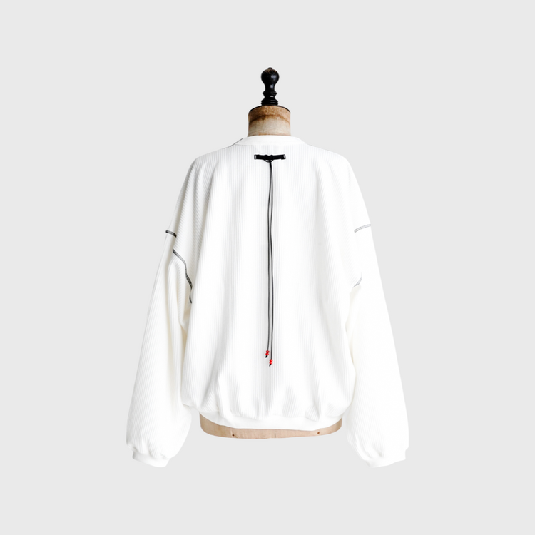 素材をレールニットと呼ばれる畝が特徴的な2重の素材を使用し、オリジナルの色をつけました。アームホールを大きくとり、 裾リブ,袖リブをややキツくし、結果ゆとりがのってくることで、独特なシルエットを作っております。袖先にたっぷりと生地が溜まり、 長いパンツでもショートパンツでもバランスよく着用できます。