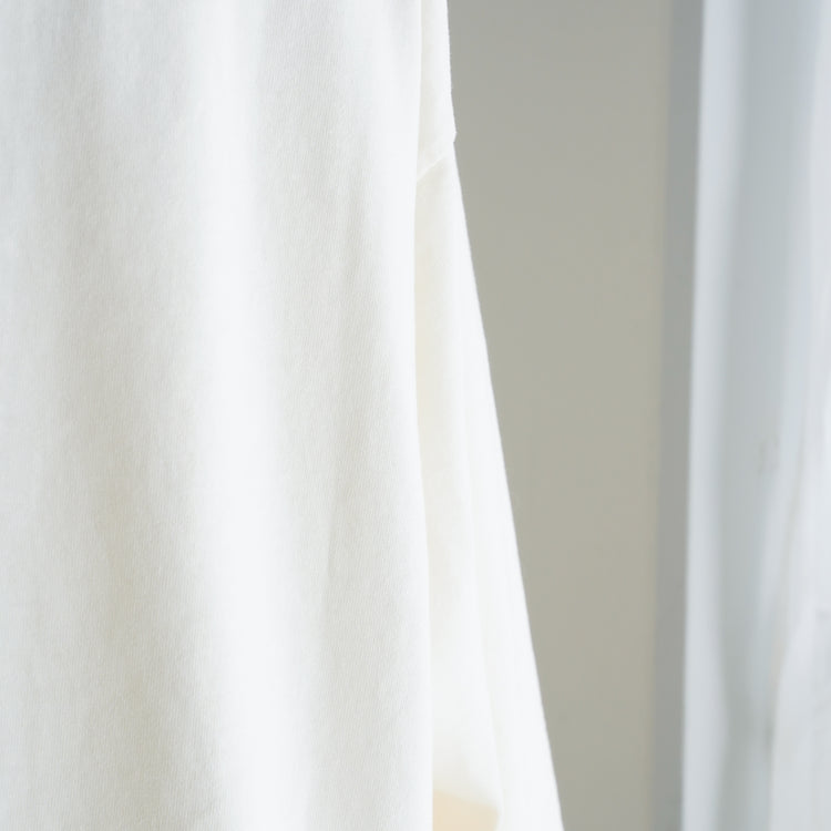 綿100%の天竺を使用し製品染めを施して柔らかさ、着心地を向上させています。身幅にゆとりを持たせたサイズ感にしています。