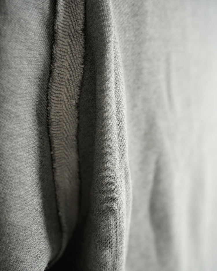 綿100%の裏毛を使用し製品に後染め加工を施して柔らかさ、着心地を向上させています。身幅にゆとりを持たせたリラックスフィット。袖口、裾などはカットオフ仕様にしています。