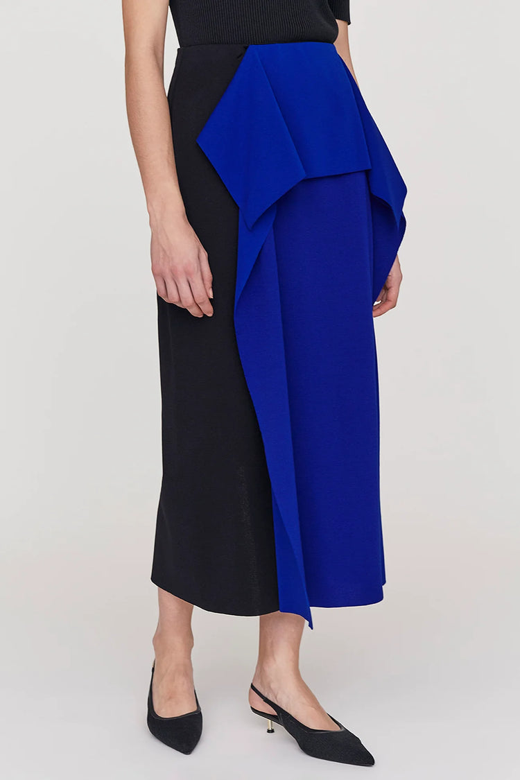 光沢感のあるミラノリブのスカート。平面と立体を掛け合わせたドレープが動くたびに美しく揺れ、エレガントな印象を引き立てます。平面と立体を掛け合わせたドレープが動くたびに美しく揺れ、エレガントな印象を引き立てます。