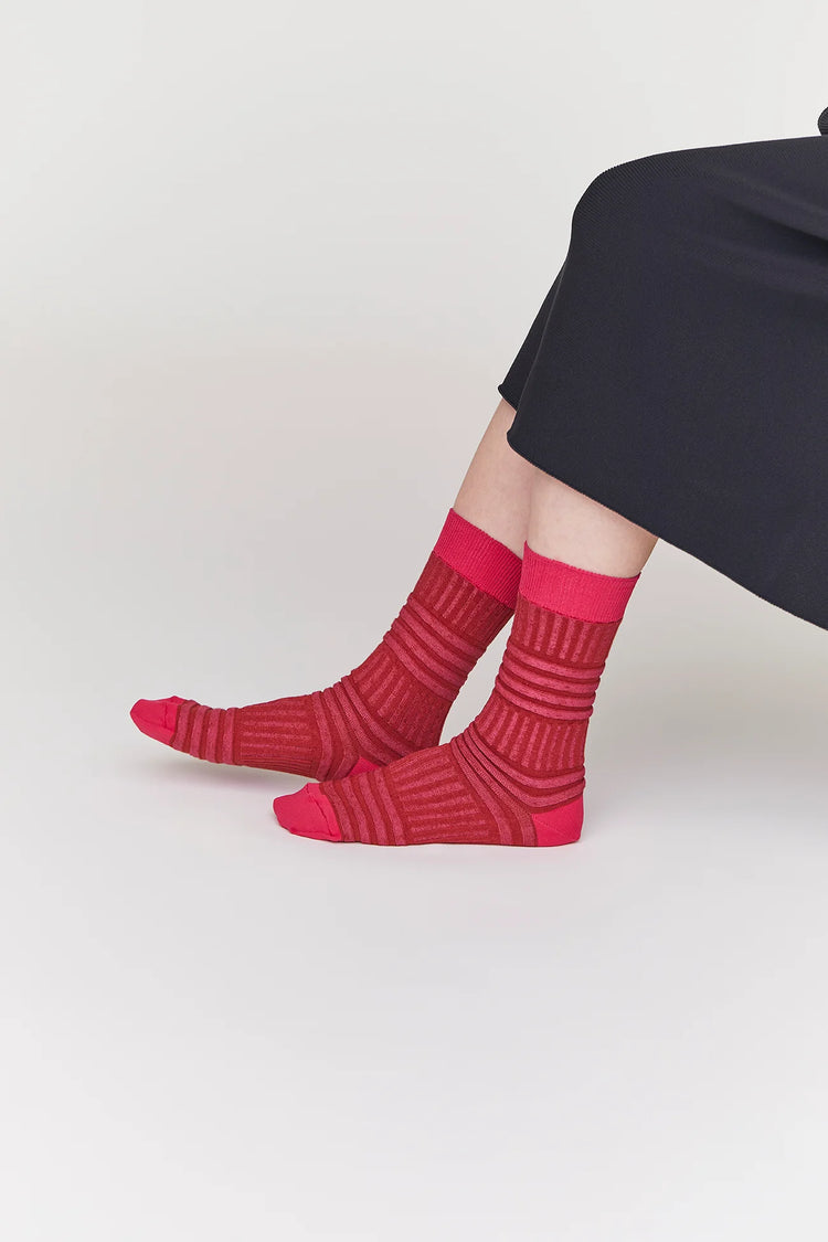 異なる2種類のリブを交互に組み合わせたユニークなシルエットが特徴のソックス。爪先やかかとなど負荷がかかる部分は再生ポリエステル、それ以外は汗を吸収しやすく肌触りのよいコットンを使用しています。見た目はユニークですが、着用するとスタイリングしやすいオーソドックスなシルエットになります。友人や大切な方への贈り物にもおすすめです。