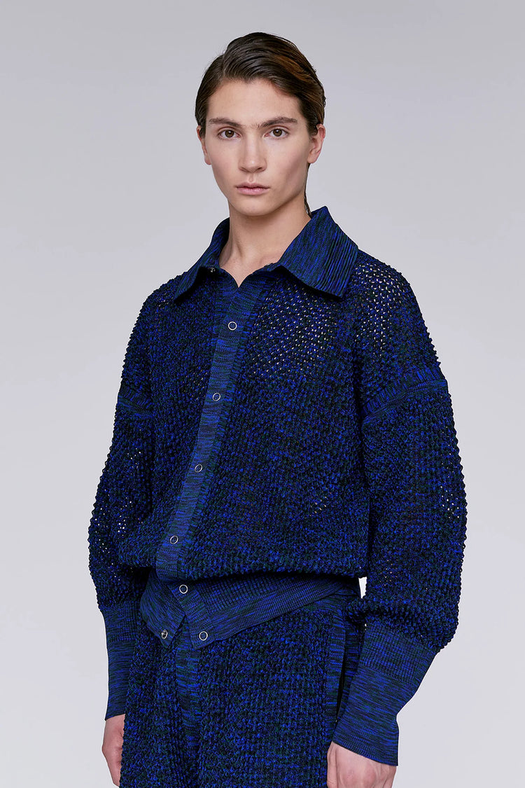 ワッフル編みのテクスチャが特徴のブルゾン。絣染めにインスパイアされた技法で糸を染め、立体的に編み立てました。ゆったりとしたシルエットで、透け感を活かしたスタイリングが楽しめます。ドロップショルダーがリラックスした印象を与え、快適な着心地です。