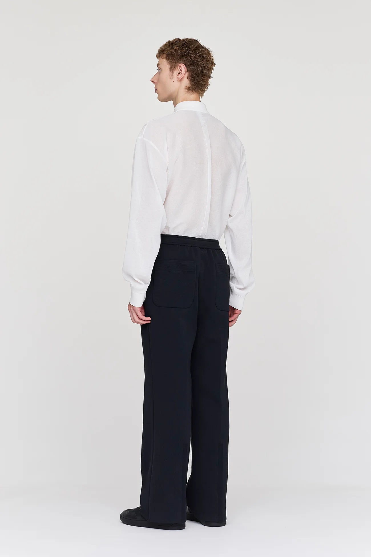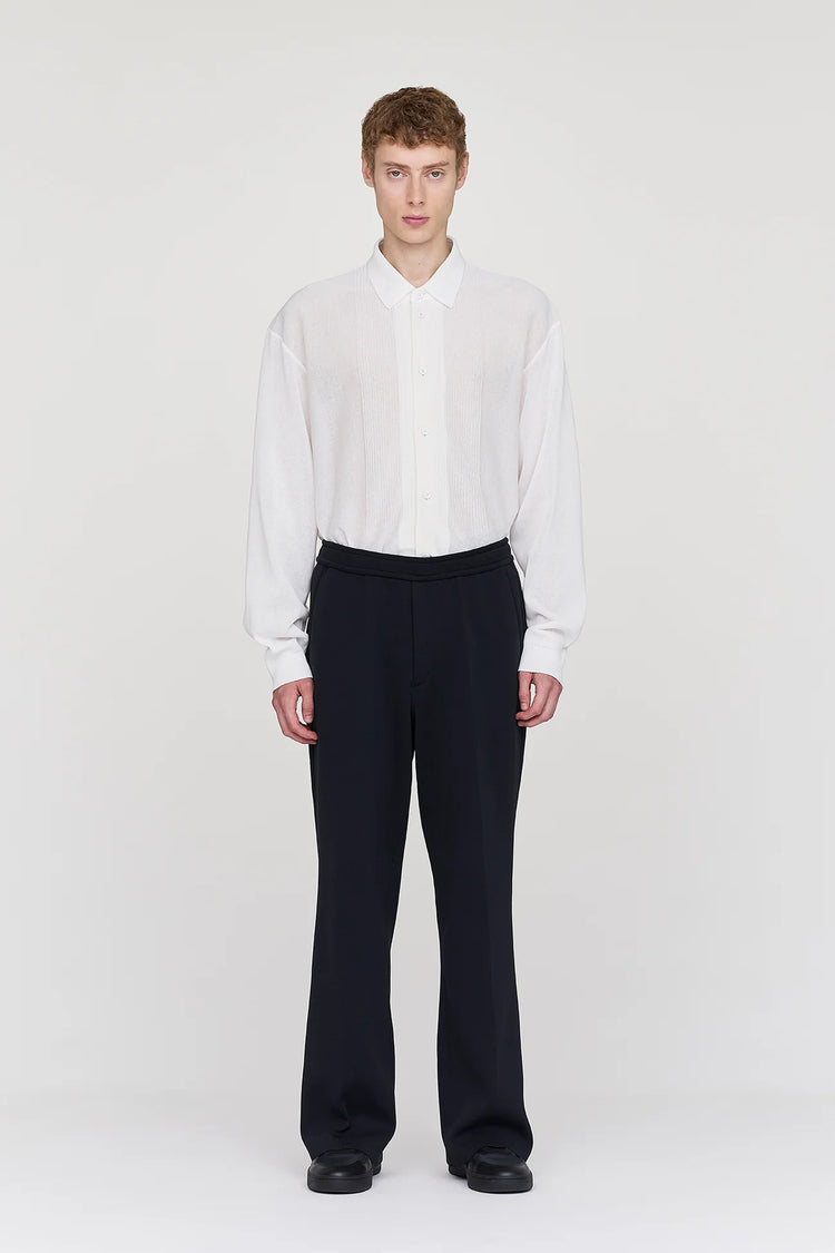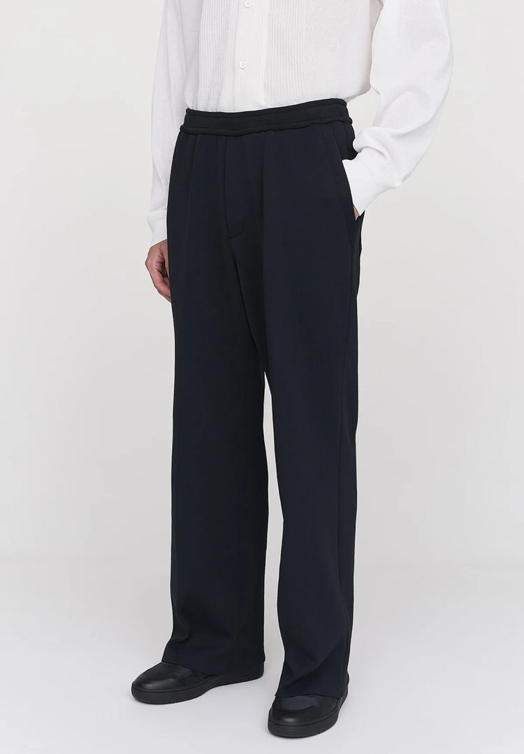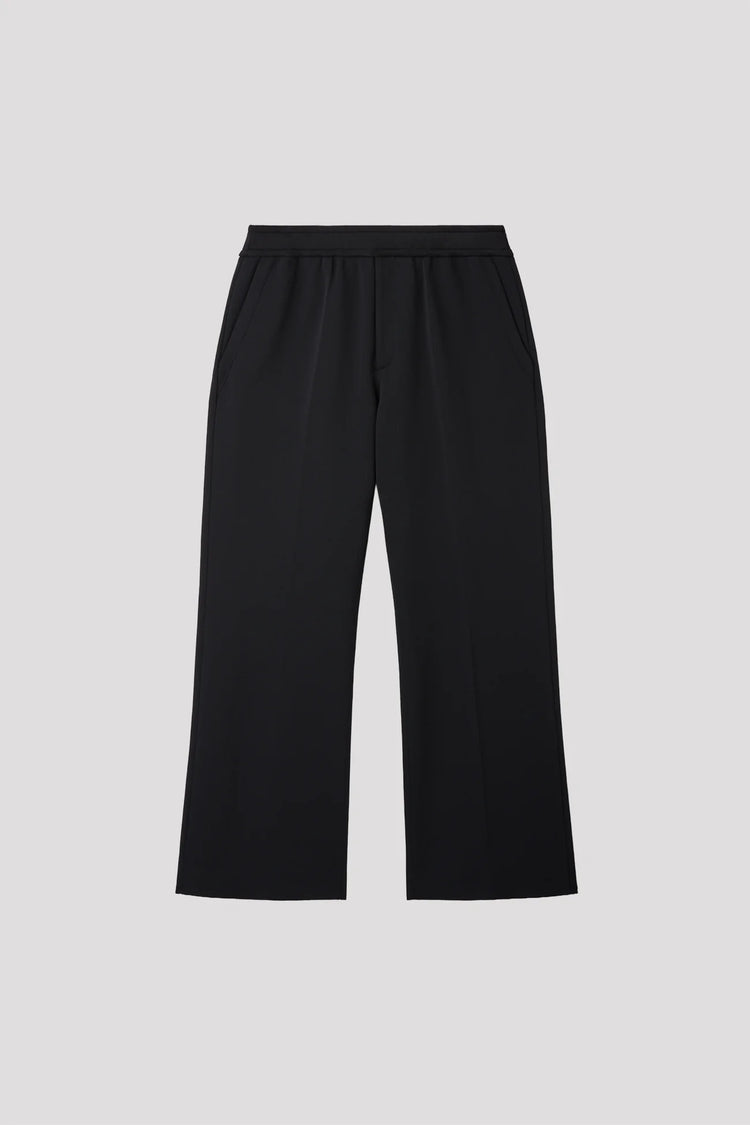 ソリッドなミラノリブのセミワイドパンツ。ストレートシルエットにクリースラインを施し、すっきりとした印象に仕上げています。ストレッチ性に富んだ快適な着心地のうえ、着脱のしやすいドローコード付きのゴムウエストを採用しています。