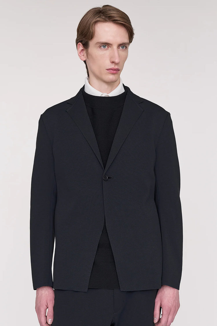 セミフィットなミラノリブのテーラードジャケット。プログラミング技術ならではの編み端を活用したデザインは、見返しや裾の折り返しがなく軽やかな印象を与えます。ディテールや切り替え、ステッチを最小限に抑え、高めの位置に設定された一つボタンが、ソリッドでミニマルなデザインです。
