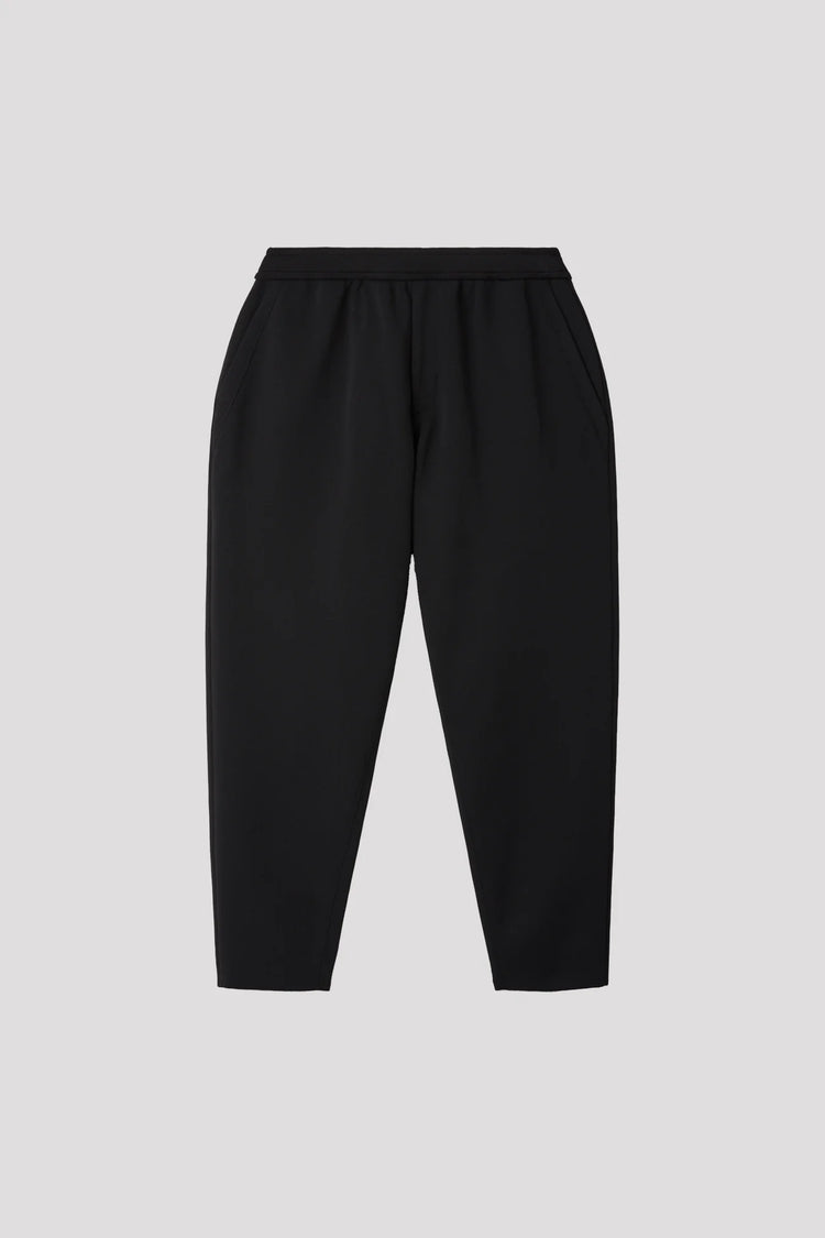 ソリッドなミラノリブのテーパードパンツです。ヒップ周りにはたっぷりとしたゆとりを持たせ、裾に向けてニットならではの極端なテーパードをかけることでリラックスさと快活なイメージを両立しています。ストレッチ性に富んだ快適な着心地のうえ、着脱のしやすい紐付きのゴムウエストを採用しています。