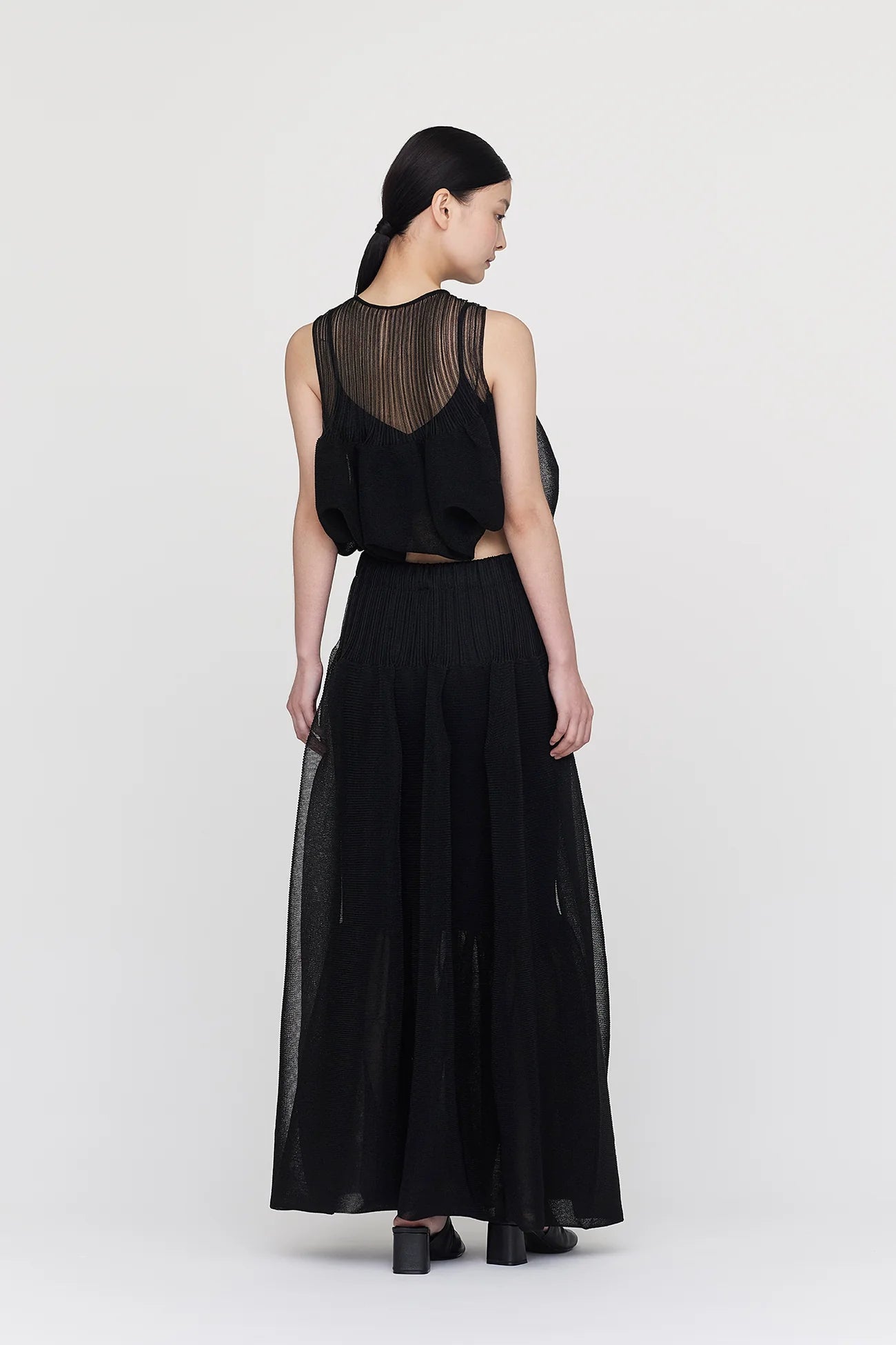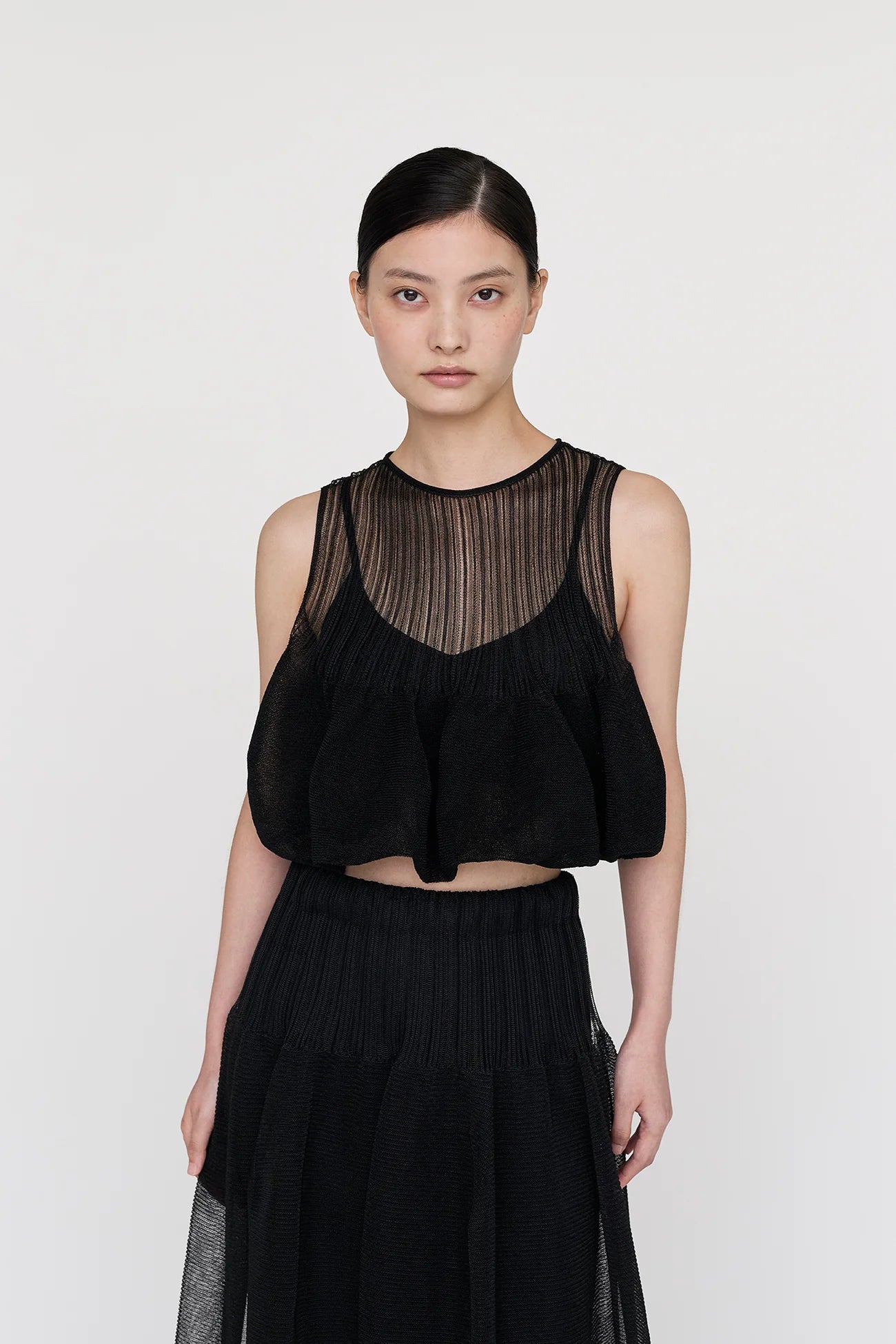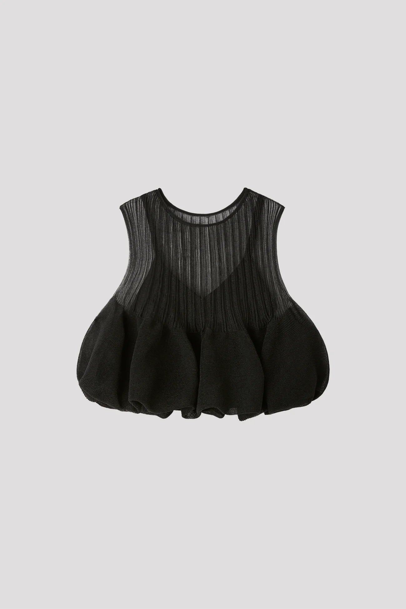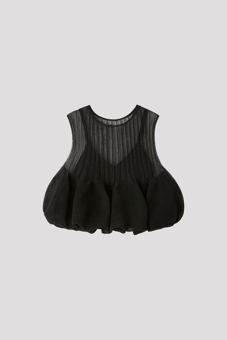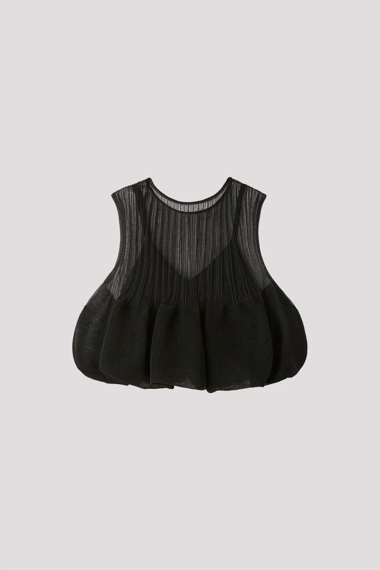 CFCLを象徴するPOTTERYを、透明感のある軽やかな素材で表現したトップ。内側をタイトフィットにすることで、レイヤードされたフレアが立体的で美しいシルエットを生み出します。縫い代がなく、ストレッチ性に優れ、快適な着心地です。
