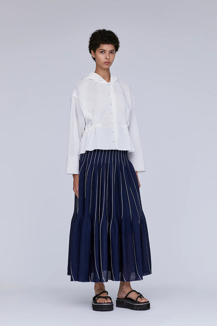 円形のパターン、立体的なギャザーが特徴のスカート。 3Dコンピューター・ニッティングの技術により、縫い代のない仕立てでギャザーを作り出しました。ウエストから広がるたっぷりとしたティアードの広がりがドラマティックな雰囲気を演出。繊細なピンストライプ柄が洗練された印象を与えます。日常から楽に着用できるゴムウエストはストレッチ性に優れ、縫い代がなく、快適な着心地です。