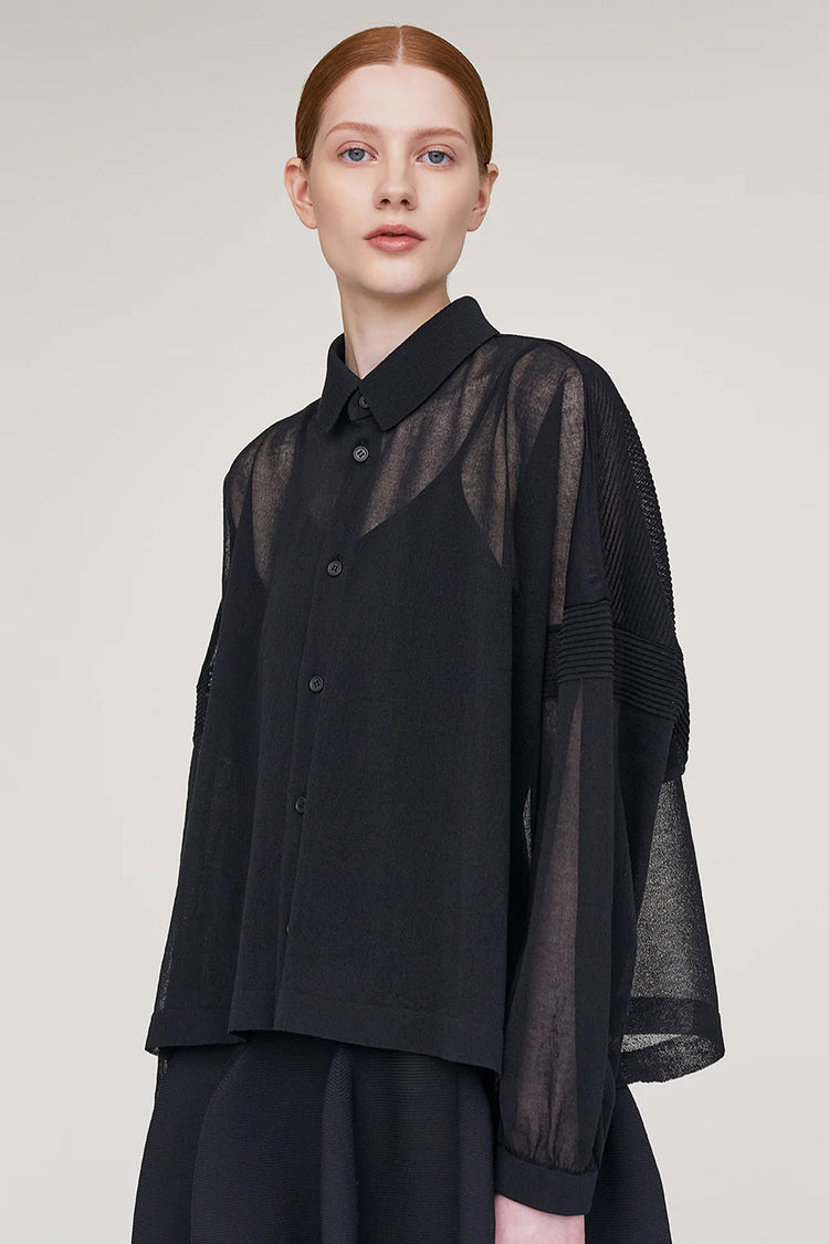 ガーゼのような肌触りが心地よいオーバーサイズのシャツ。シアー感のある素材が軽やかでエレガントな印象を与えます。立体的なフォルムの袖にタックを施し、構築的なアクセントを添えたデザインです。