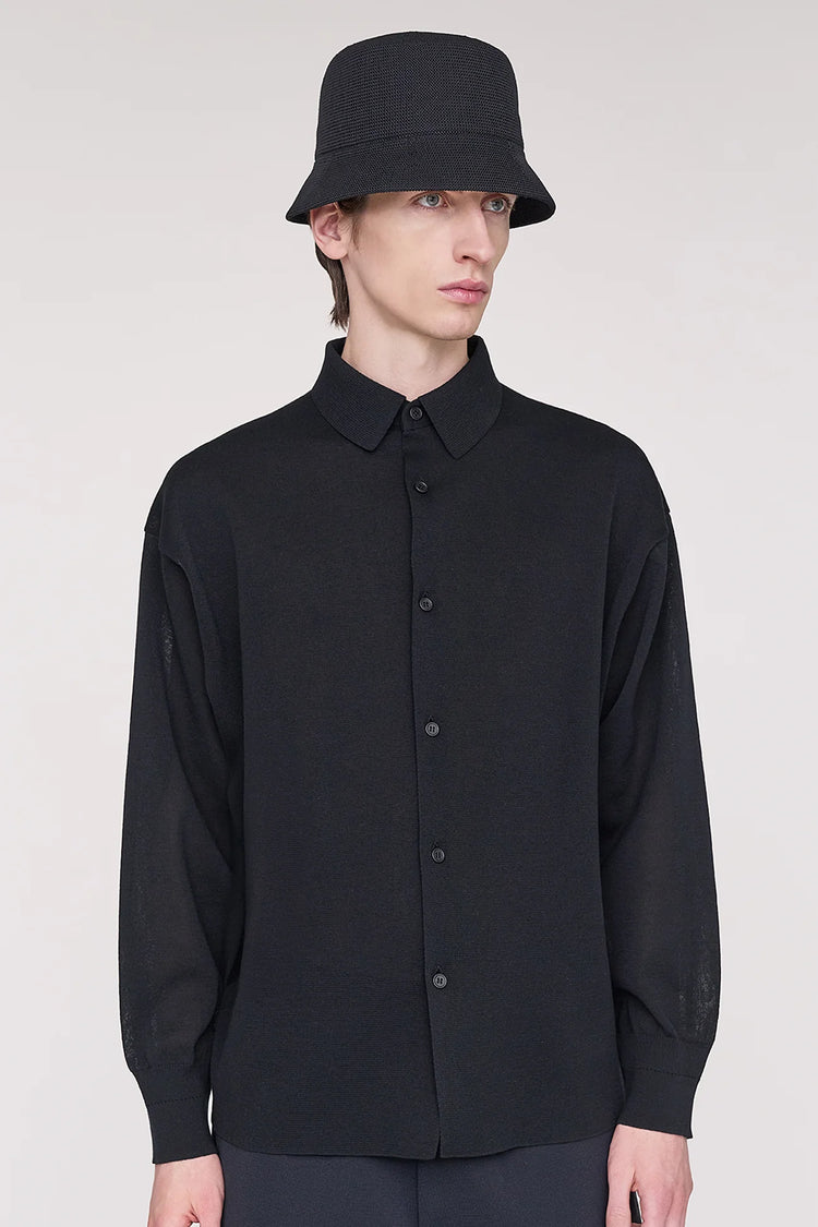 ゆったりしたシルエットのシャツです。ガーゼのようなシャリ感のある肌触りが心地よい素材で、後身頃と袖には透け感のある編み地を使用し、涼しげで軽やかな印象を演出します。パッチポケットが付き、通気性に優れ、快適な着心地です。
