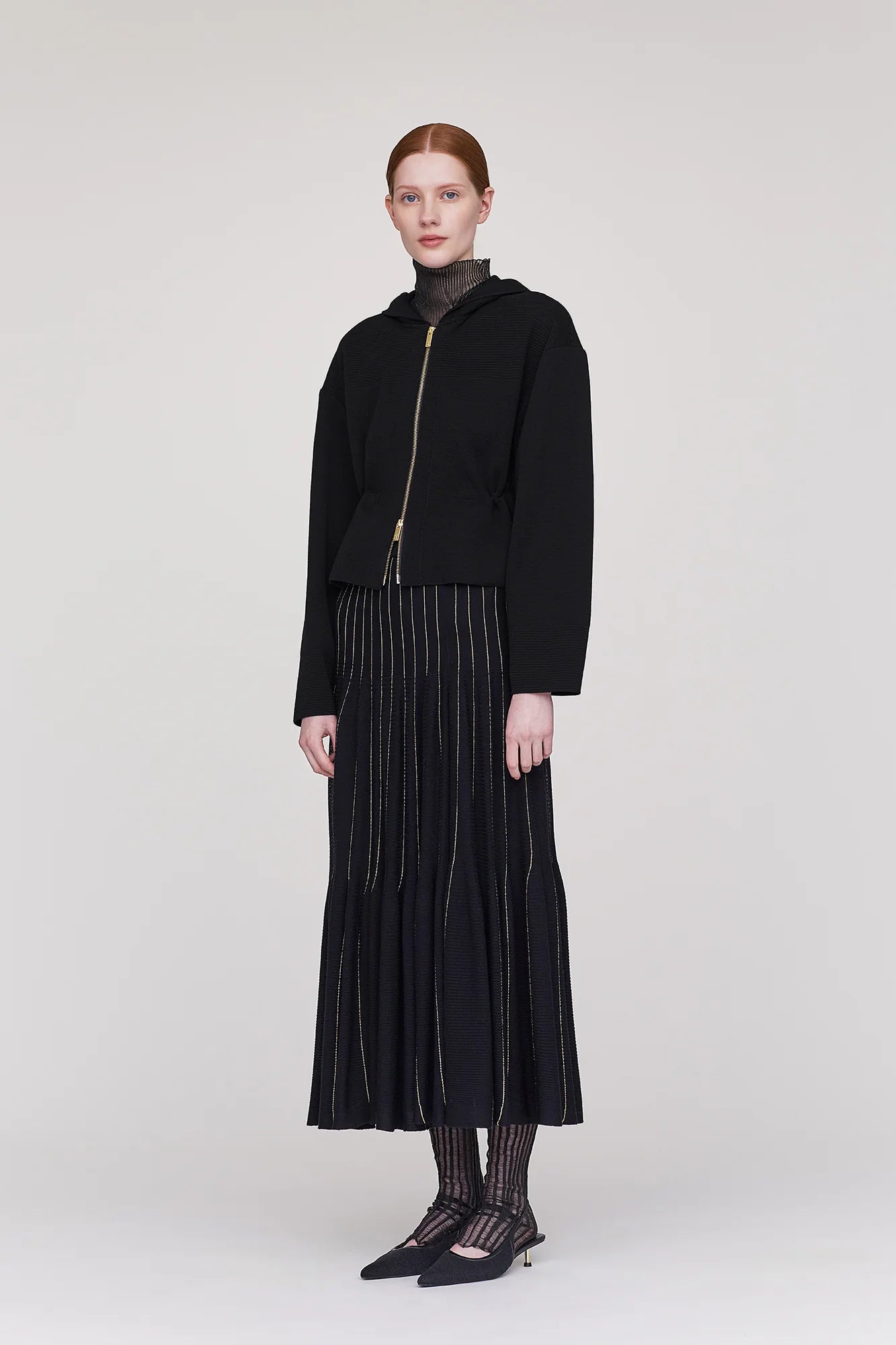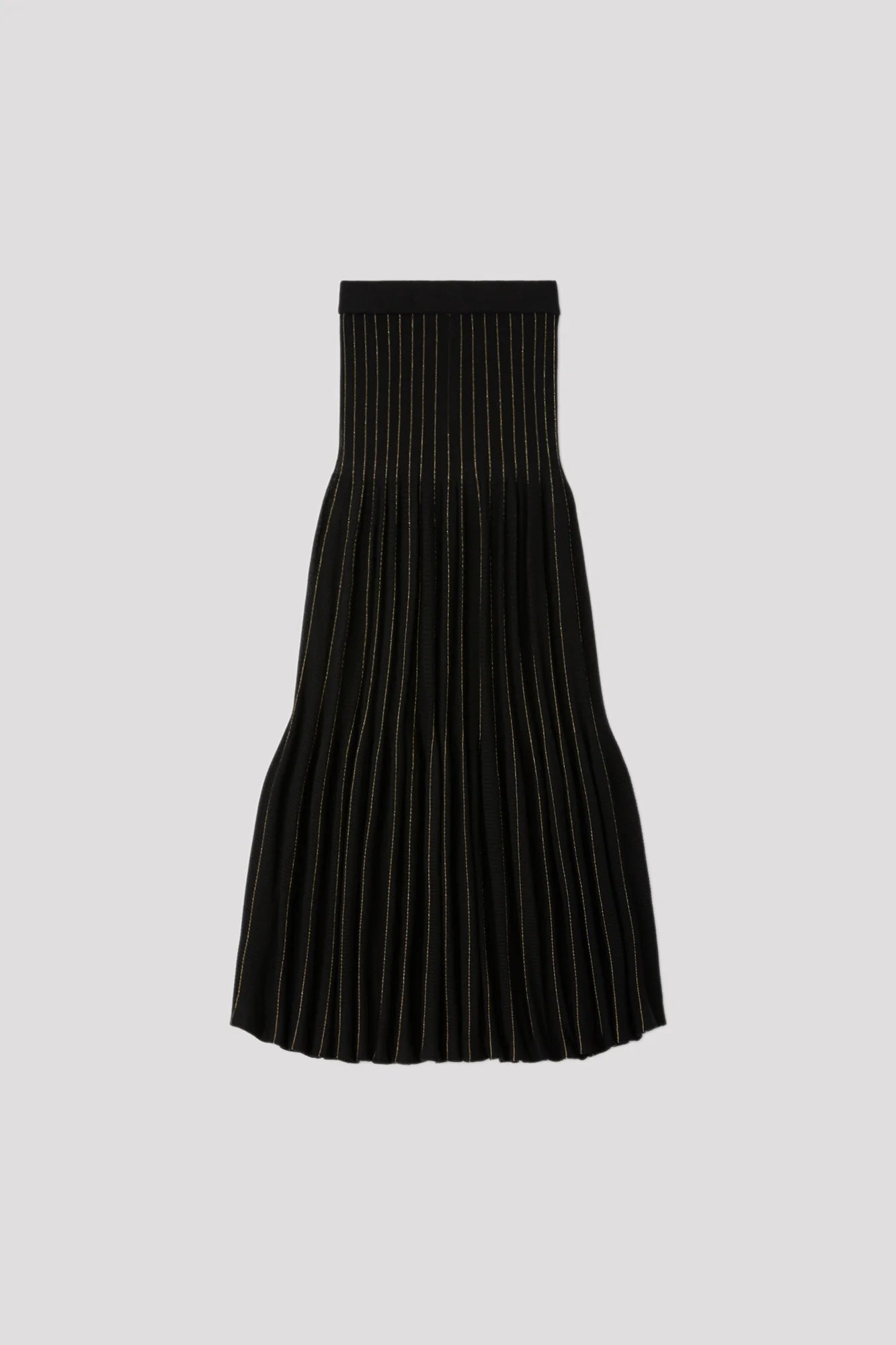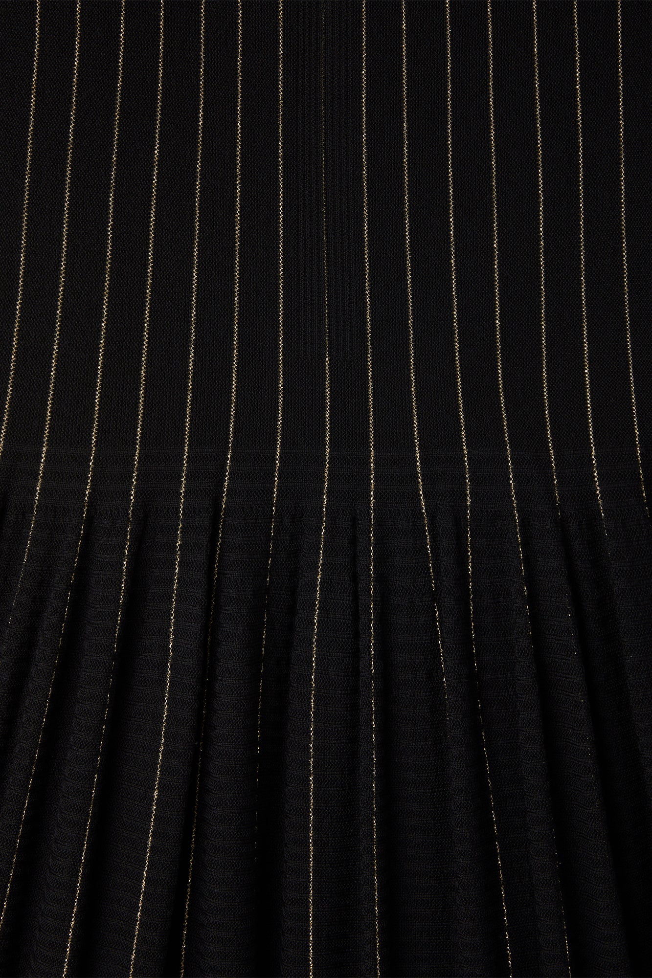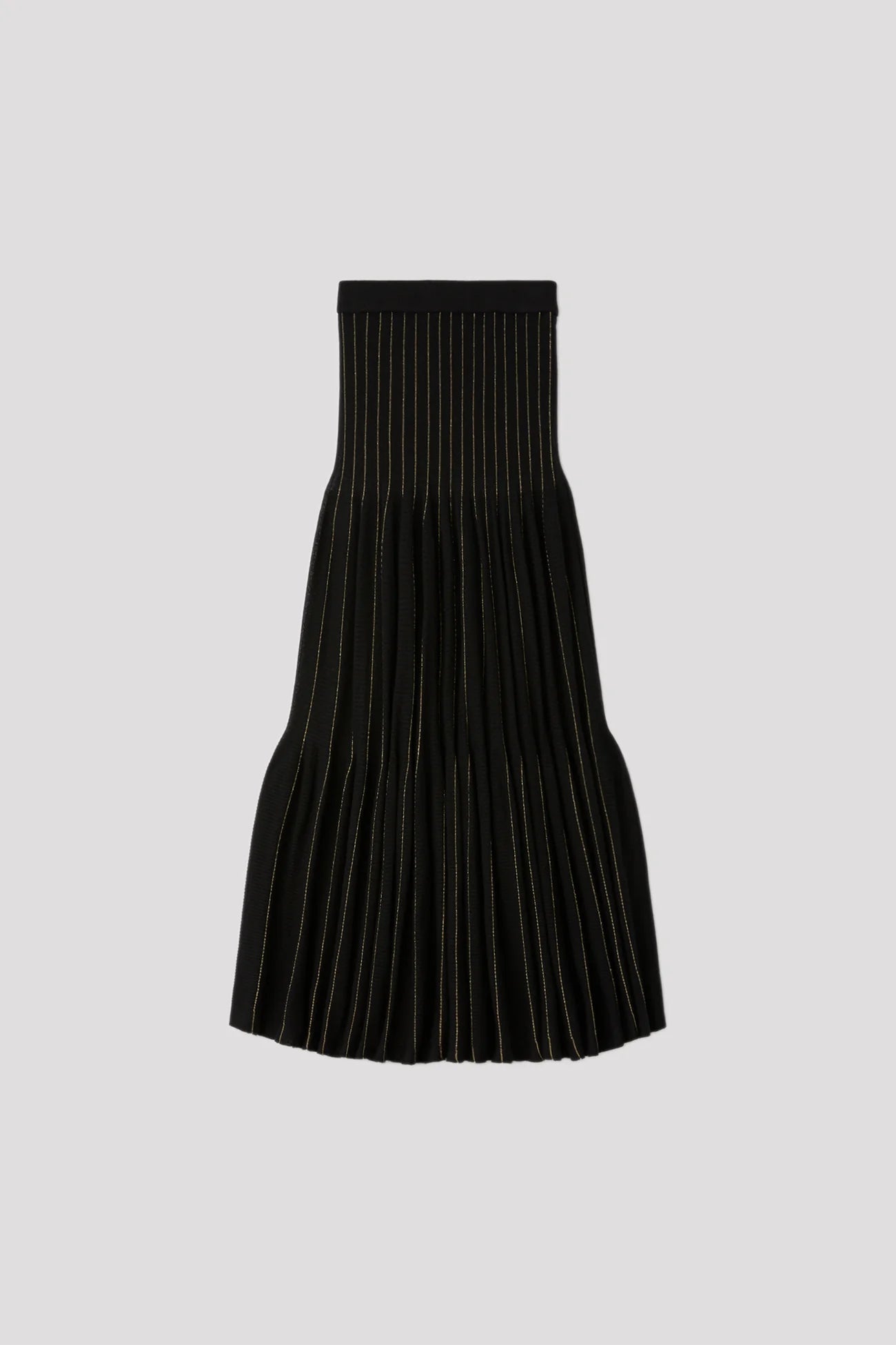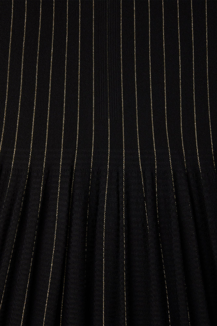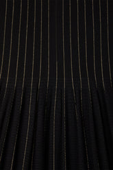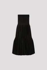 円形のパターン、立体的なギャザーが特徴のスカート。 3Dコンピューター・ニッティングの技術により、縫い代のない仕立てでギャザーを作り出しました。裾に向かって広がるたっぷりとしたティアードの広がりがドラマティックな雰囲気を演出。全面にウール、ピンストライプ部分にラメ糸を使用し、暖かな風合いに華やかさを与えます。