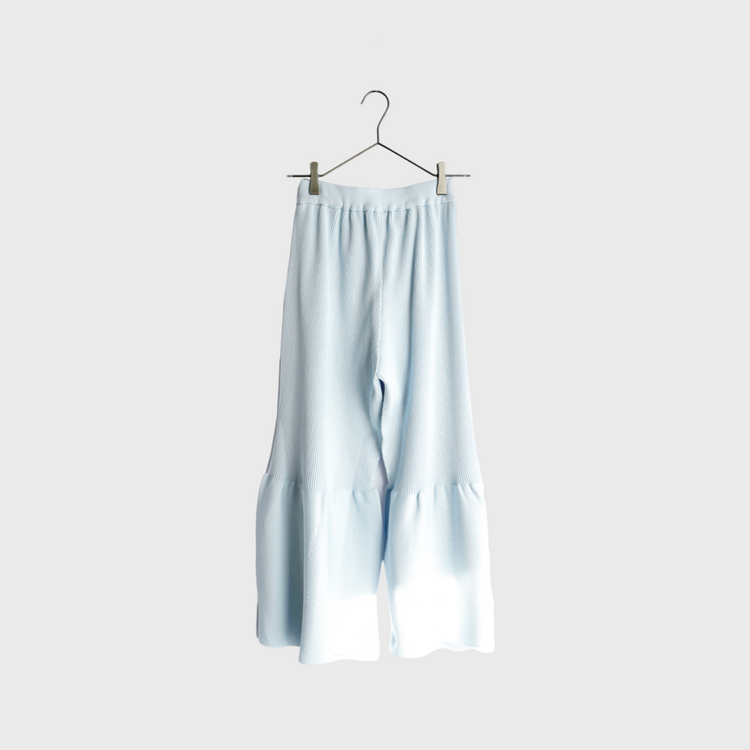 膝下からたっぷりのボリュームを持たせたフレアパンツ。すっとした縦長のタイトなシルエットからPORTRAIT(縦長)と名付けました。右左それぞれ無縫製で筒状に編み立て、股ぐりで縫製しています。着やすいゴムウェスト仕様。パンツにデザインされたシームレスなフレアがモードな印象を与えます。