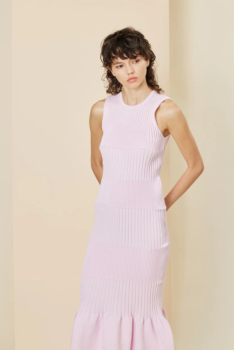 CFCLを象徴するFLUTEDシリーズのマーメイドドレスです。ストレッチ性の違う2種類のリブを交互に編む事でユニークなシルエットを生み出します。身頃はタイトフィットなのに対し裾はガーター編みのため、ふんわりと身体から離れマーメイドのようなシルエットを演出します。