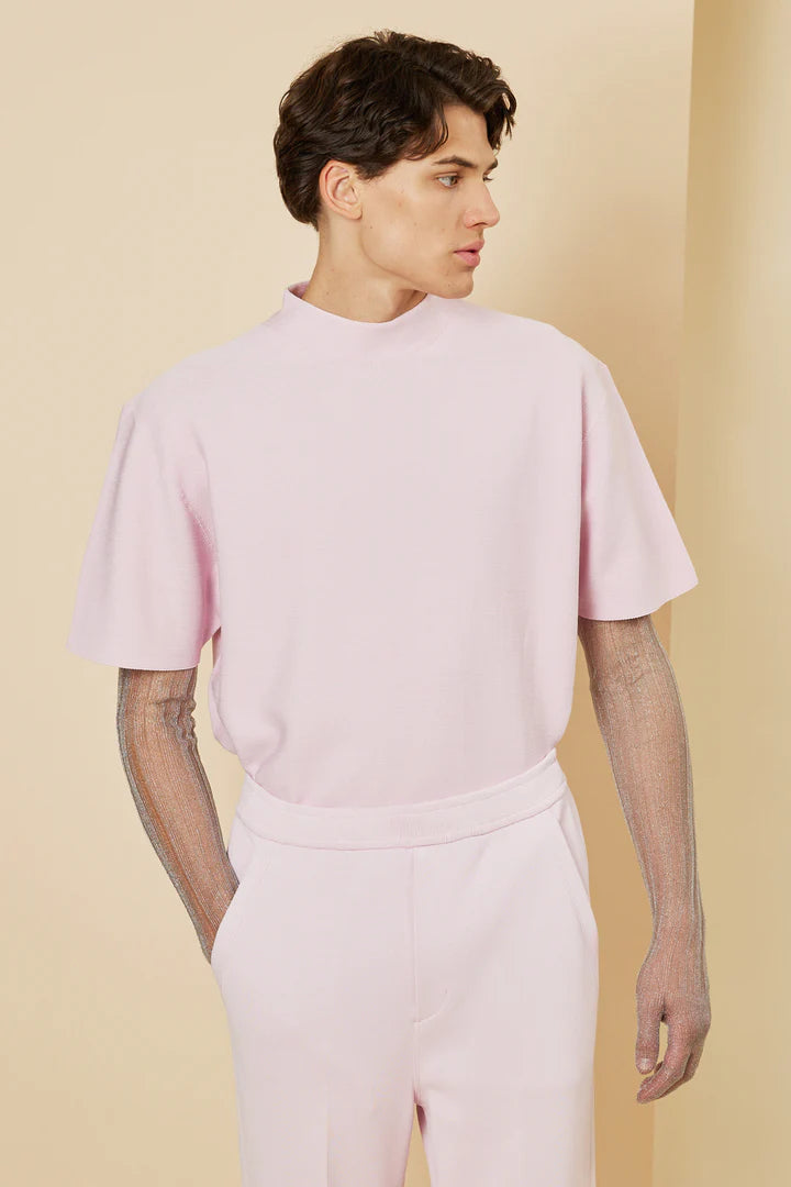 ミニマルなショートスリーブモックネックTシャツです。無縫製でストレッチ性に優れています。袖のセンタークリースが構築的な印象を与えます。パンツのポケットに手を入れやすいように深めの両脇にスリット入っています。