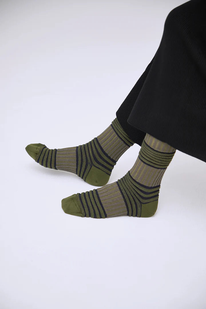 横に突っ張る性質のガーターと横に縮む性質のあるリブを交互に組み合わせたユニークなシルエットのソックスです。爪先やかかとなど負荷がかかる部分は再生ポリエステル、それ以外は汗を吸収しやすく肌触りのよいオーガニックコットンを使用しています。脱いだ時はユニークなシルエットですが、着用するとコーディネートしやすいオーソドックスなシルエットになります。