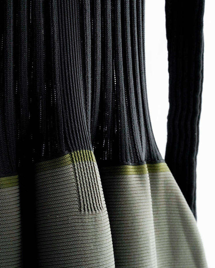 コンピュータープログラミングによって作られたボリューム感のある立体的なスカートのフォルムが特徴で、着心地よく、シンプルで、あらゆるオケージョンに対応できるデザインです。