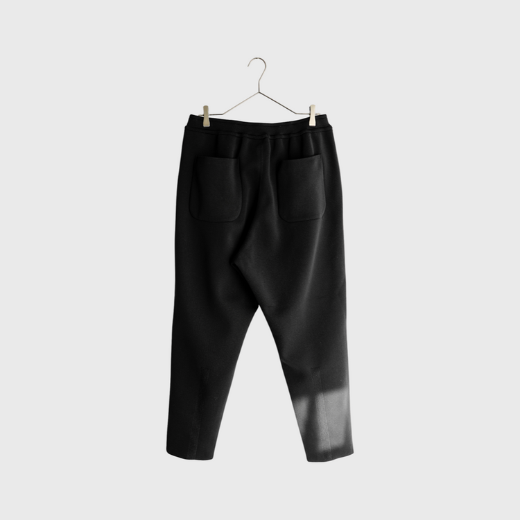 股上はやや深くお尻周りにはたっぷりとゆとりを持たせ、裾口はニットのストレッチ性を活かしたタイトフィット、リラクシングで快活なイメージの1本。