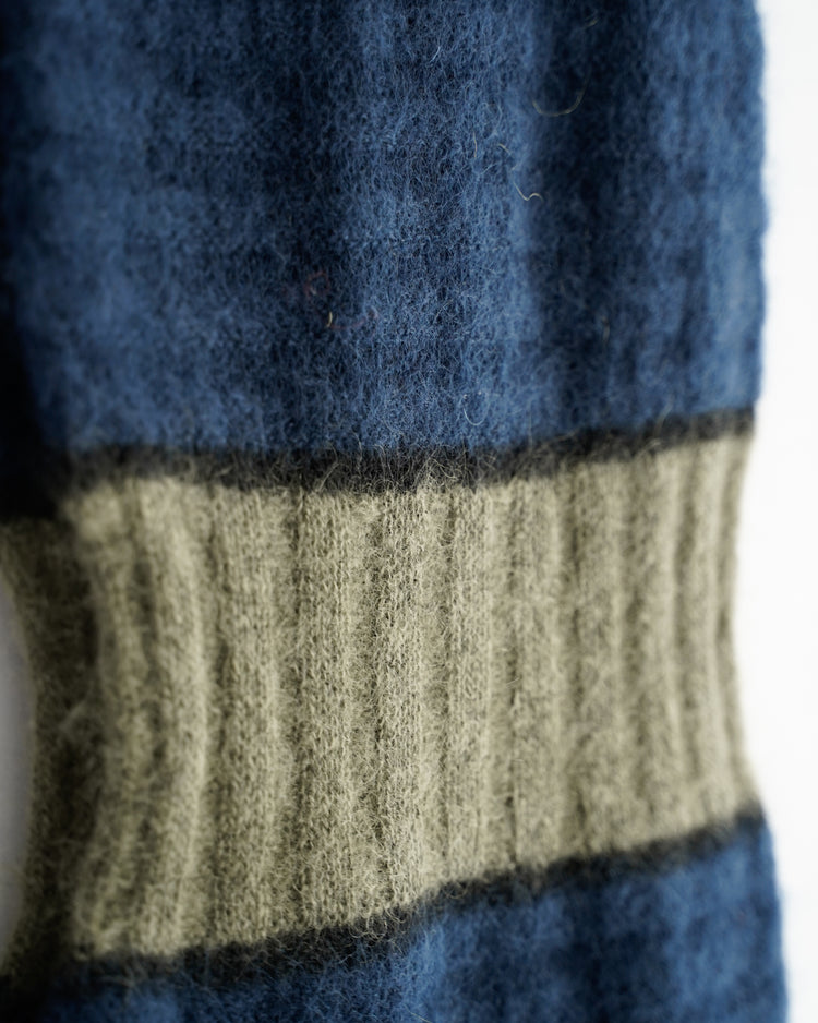 モヘア素材を使用した肉厚で柔らかな風合いと毛足の長い編み地が特徴のストールです。ストレッチ性の異なる2種類の柄を交互に編むことで、ユニークなシルエットを生み出しています。