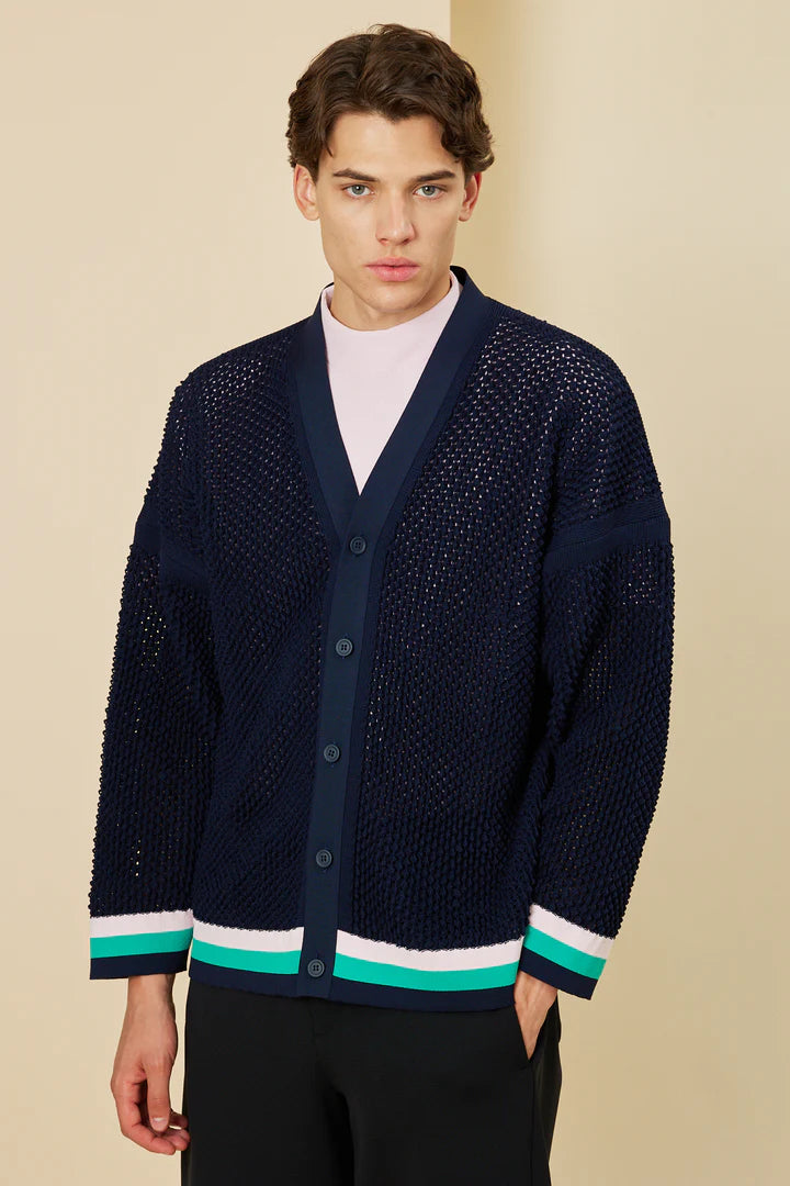 ワッフル編みのテクスチャで透け感が特徴の春夏らしいカーディガンです。程よくゆとりのあるボックスシルエットは、リラックスしてご着用いただけます。裾に入ったラインが、大きめのシルエットにも抜け感を与えます。