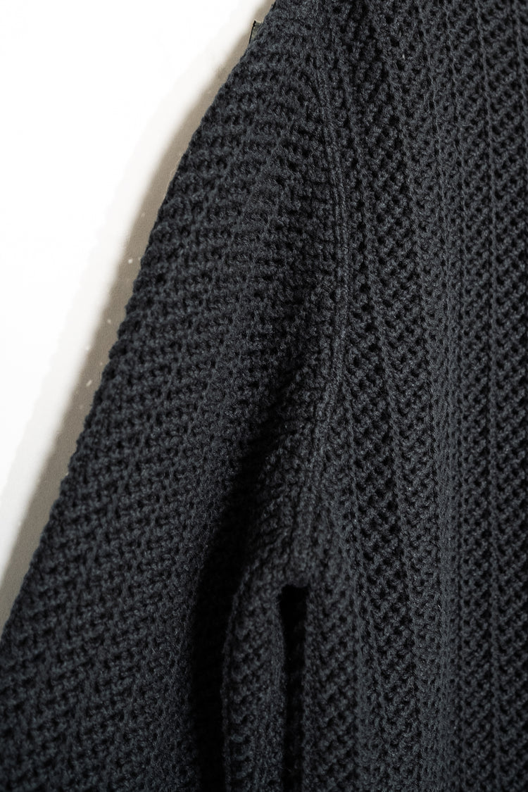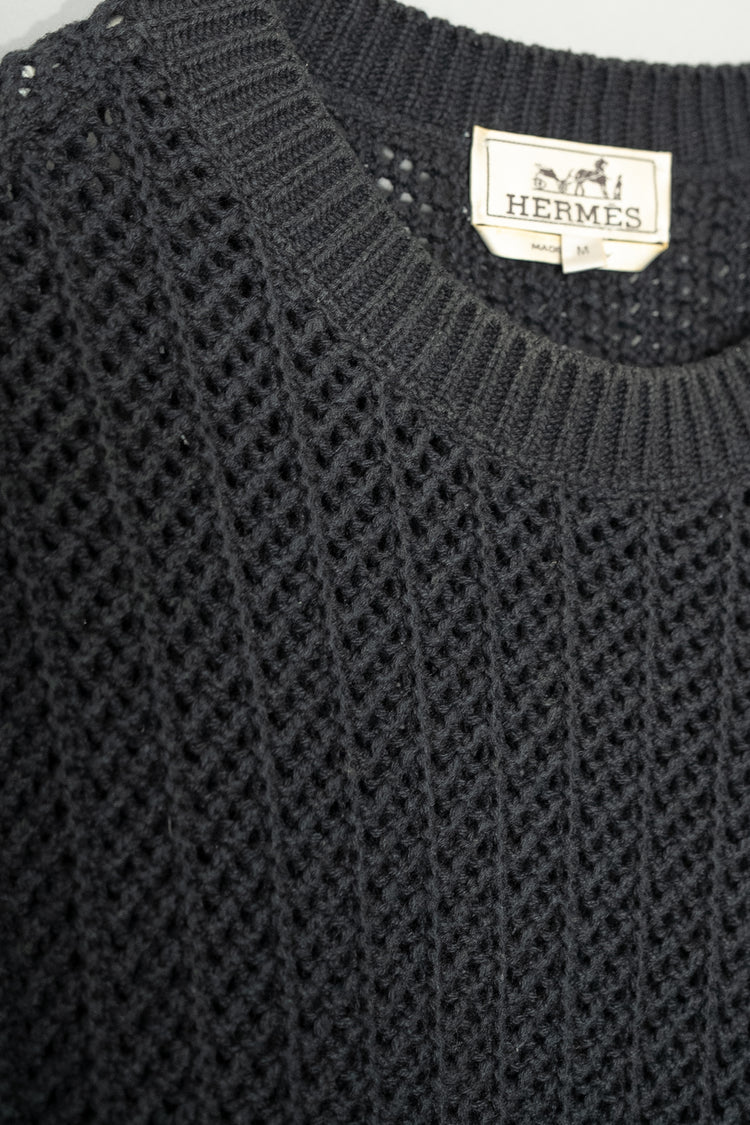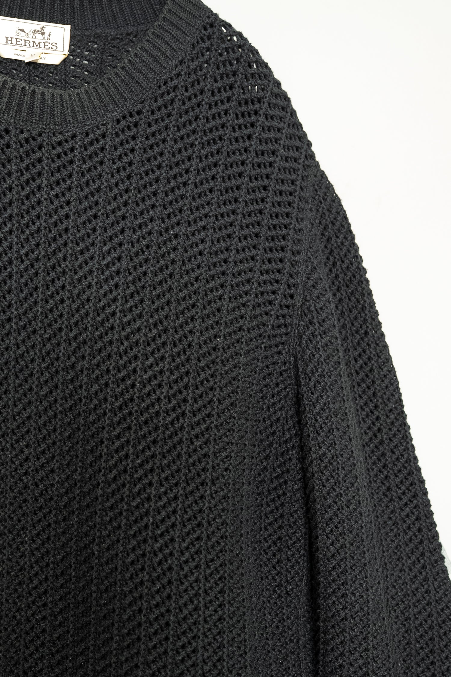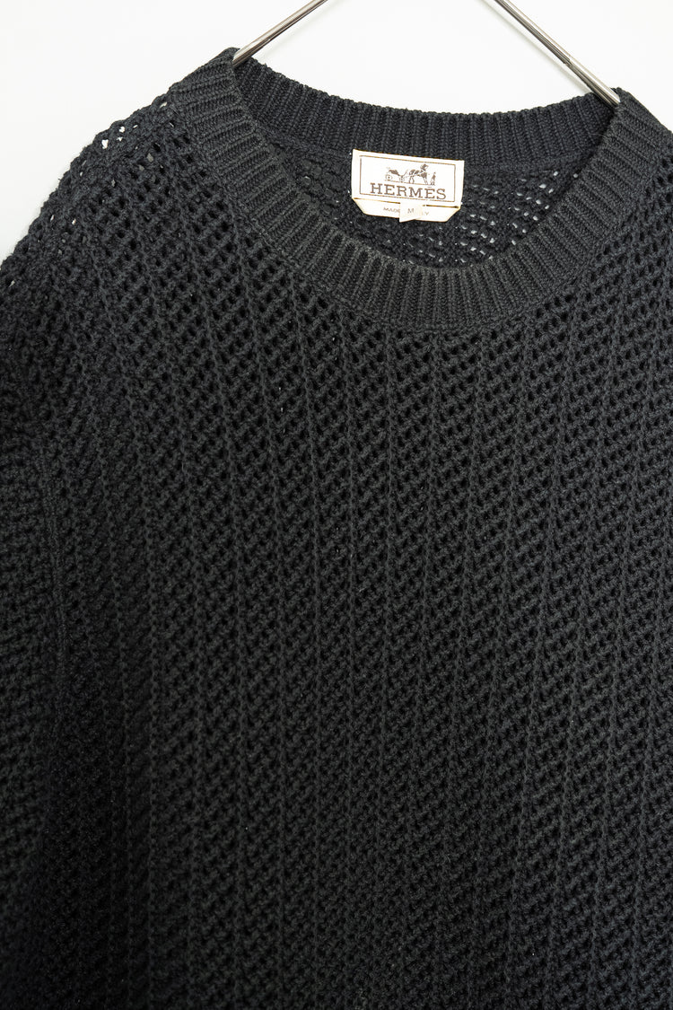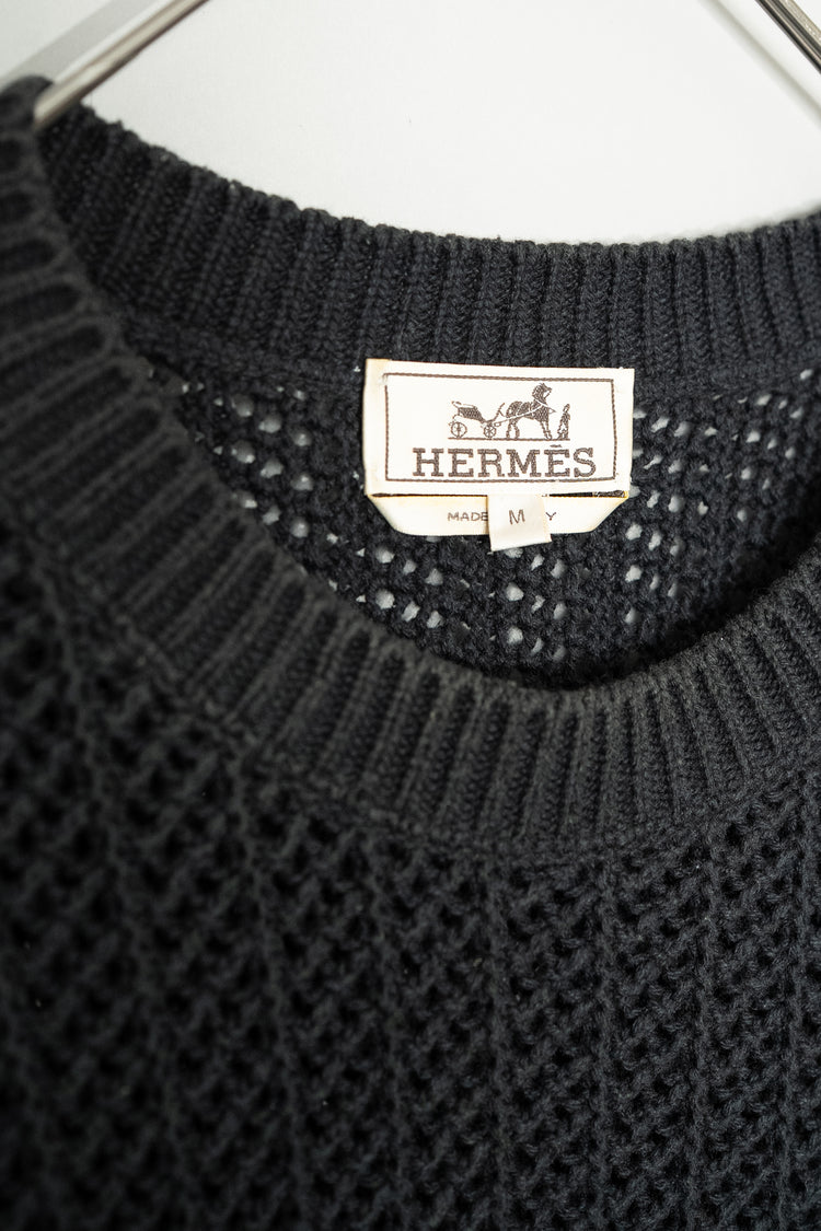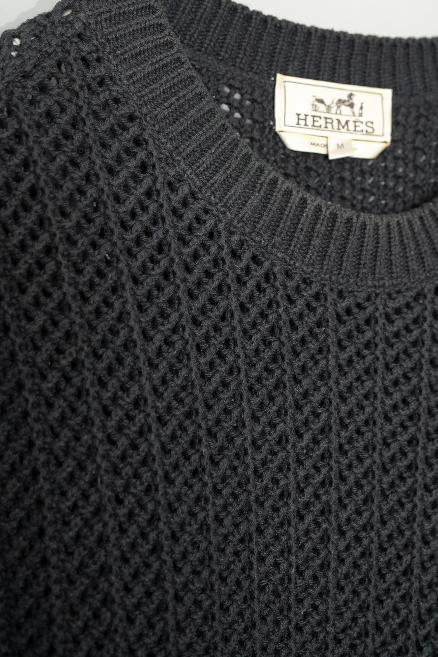 ブラックカラーをまとった本作は、一見シンプルながらも、編み構造により立体感のあるメッシュ調のデザインを採用している点が最大の魅力。編み目が細かく上品で、インナーとのレイヤード次第で表情が変わる奥深い一着です。通気性が高く、軽快な着心地でありながら、しっかりとした編み立てによって高級感を保っています。エルメスの大胆さとミニマリズムを調和させたデザインは、派手さを求めずとも存在感を放ちはじめ、まさに“大人のためのラグジュアリー”を体現しています。