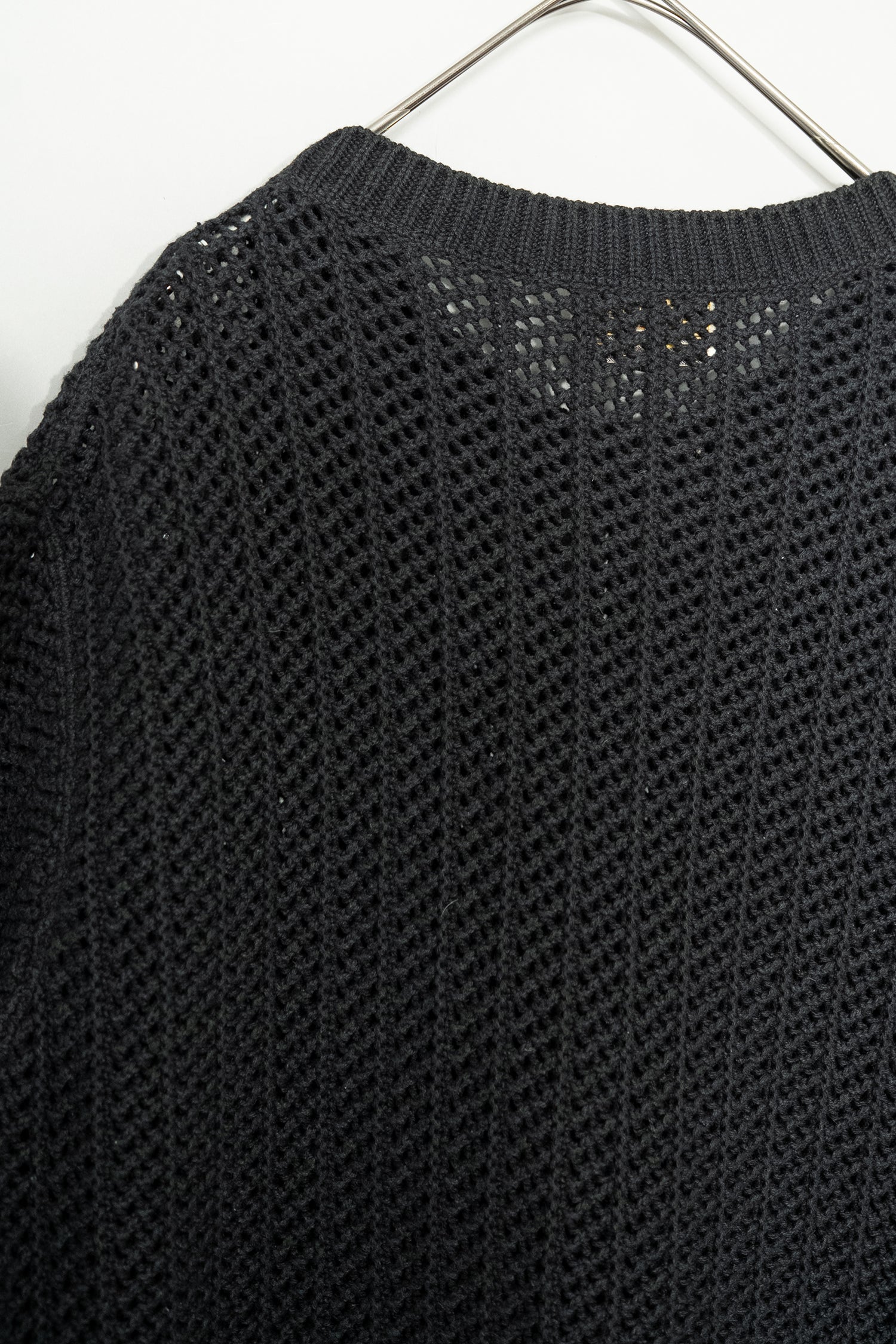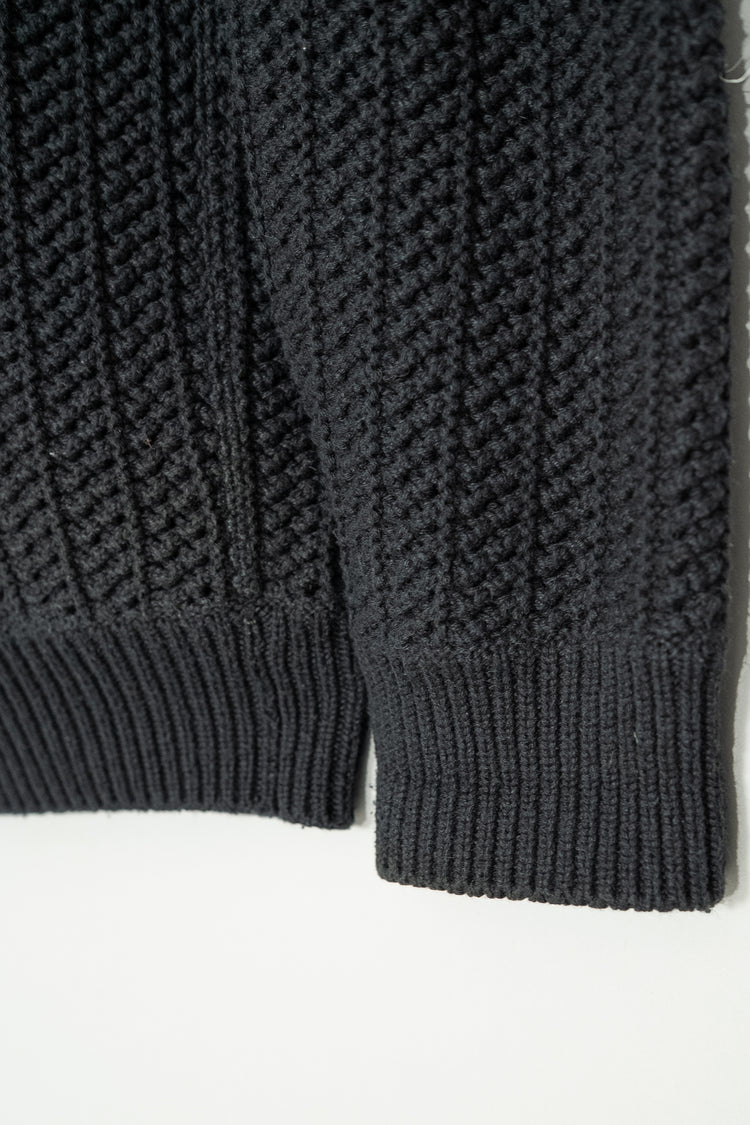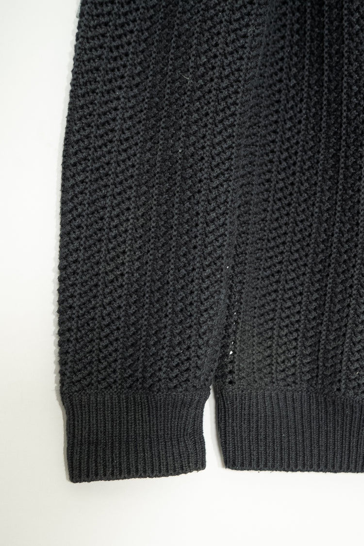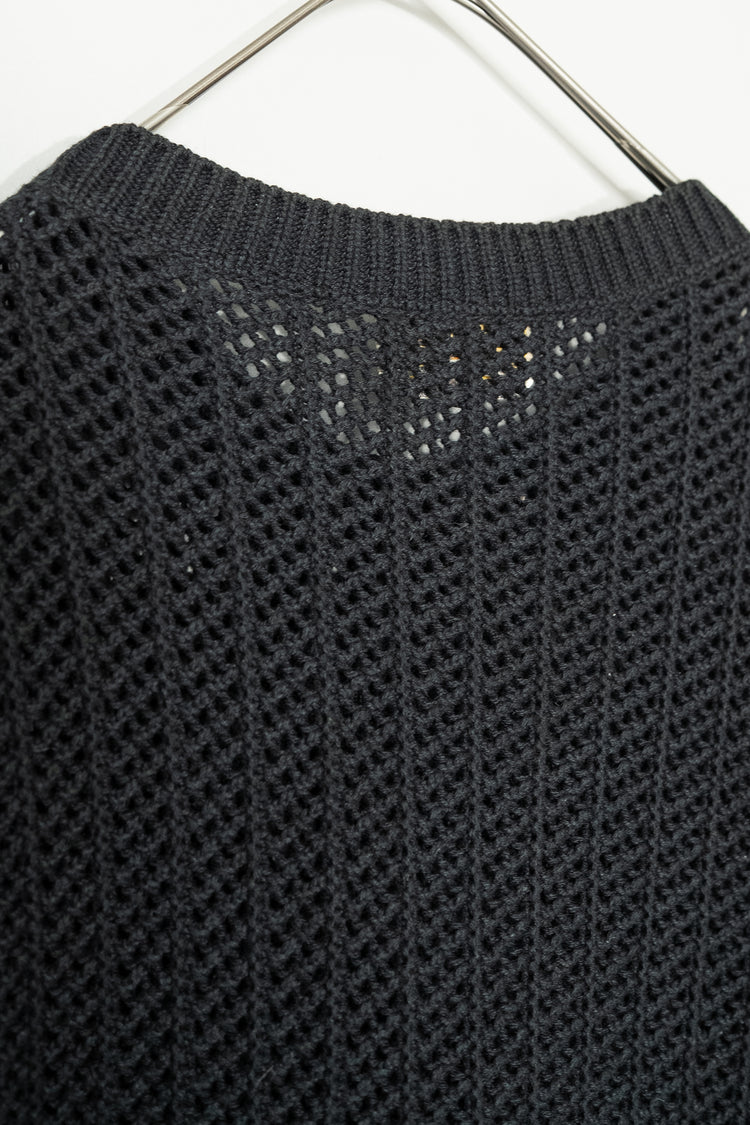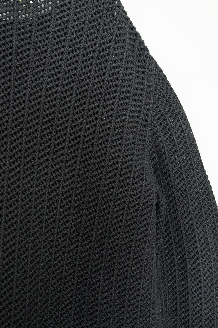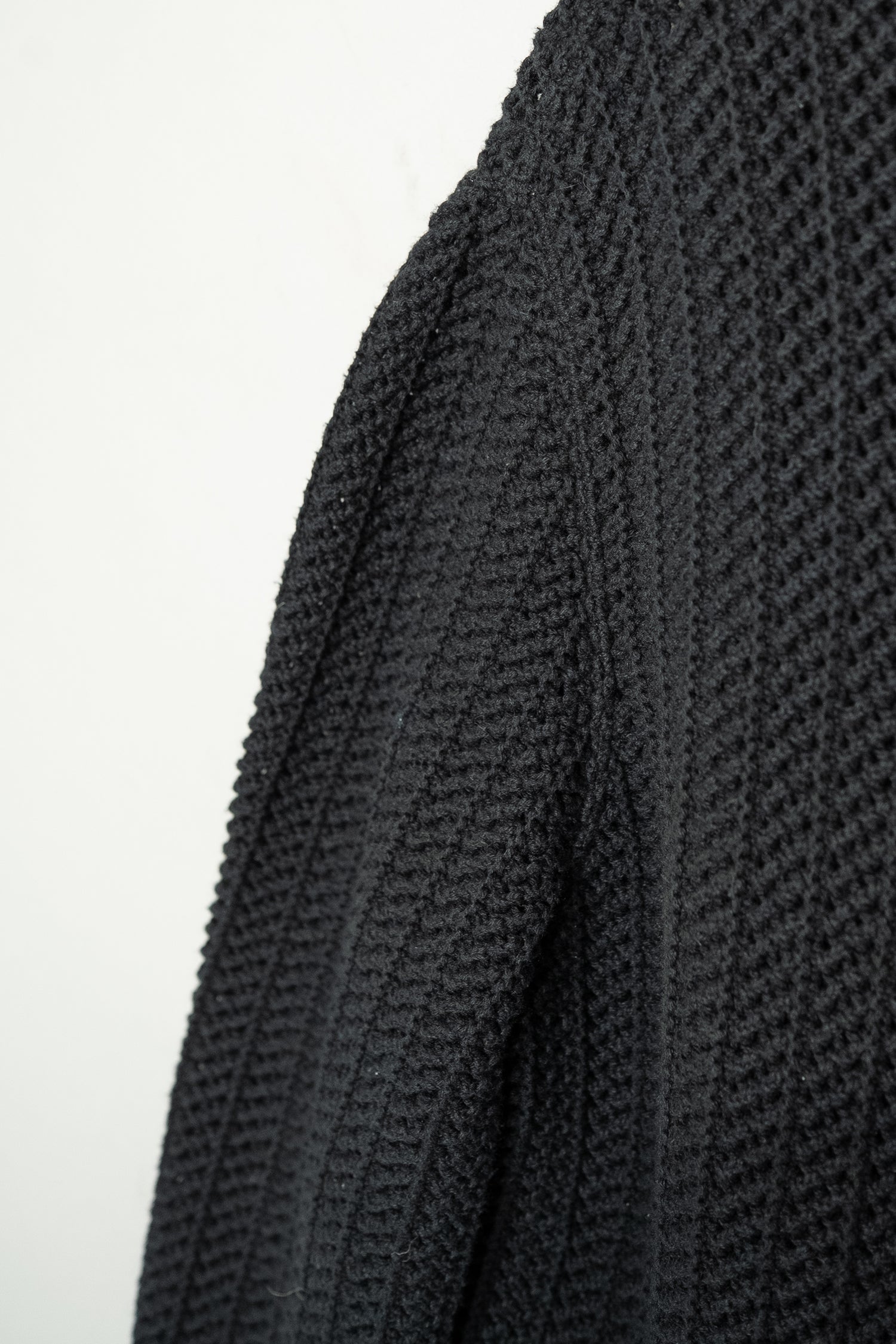 ブラックカラーをまとった本作は、一見シンプルながらも、編み構造により立体感のあるメッシュ調のデザインを採用している点が最大の魅力。編み目が細かく上品で、インナーとのレイヤード次第で表情が変わる奥深い一着です。通気性が高く、軽快な着心地でありながら、しっかりとした編み立てによって高級感を保っています。エルメスの大胆さとミニマリズムを調和させたデザインは、派手さを求めずとも存在感を放ちはじめ、まさに“大人のためのラグジュアリー”を体現しています。