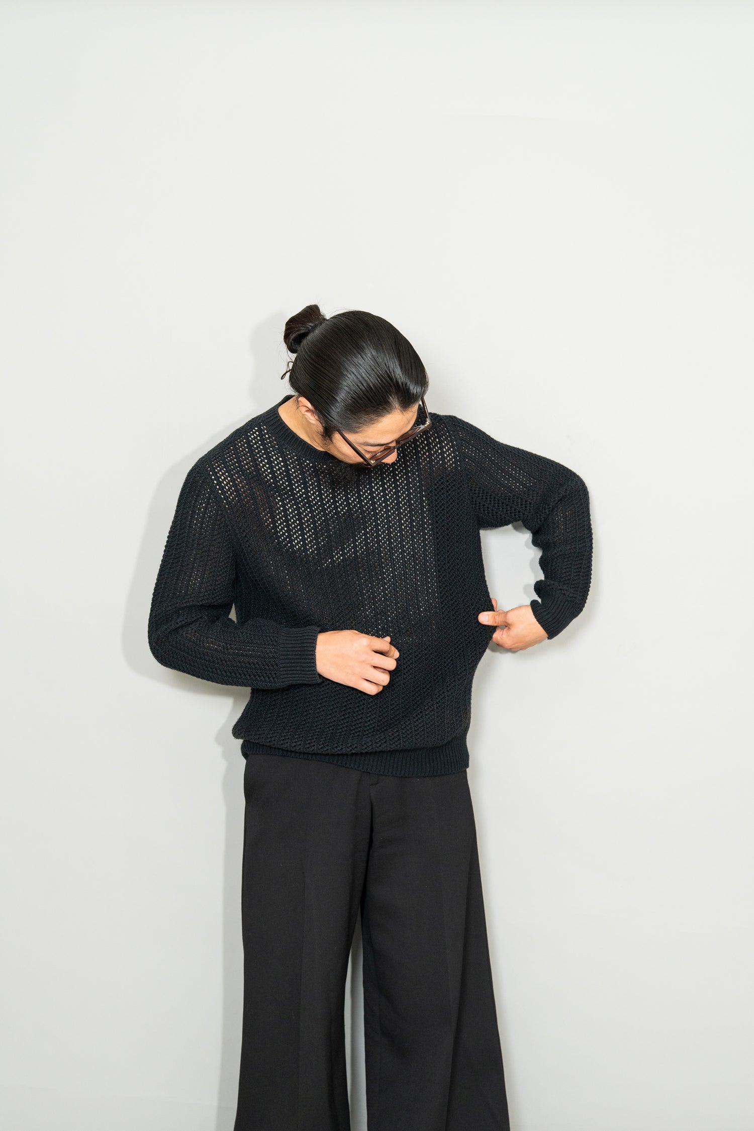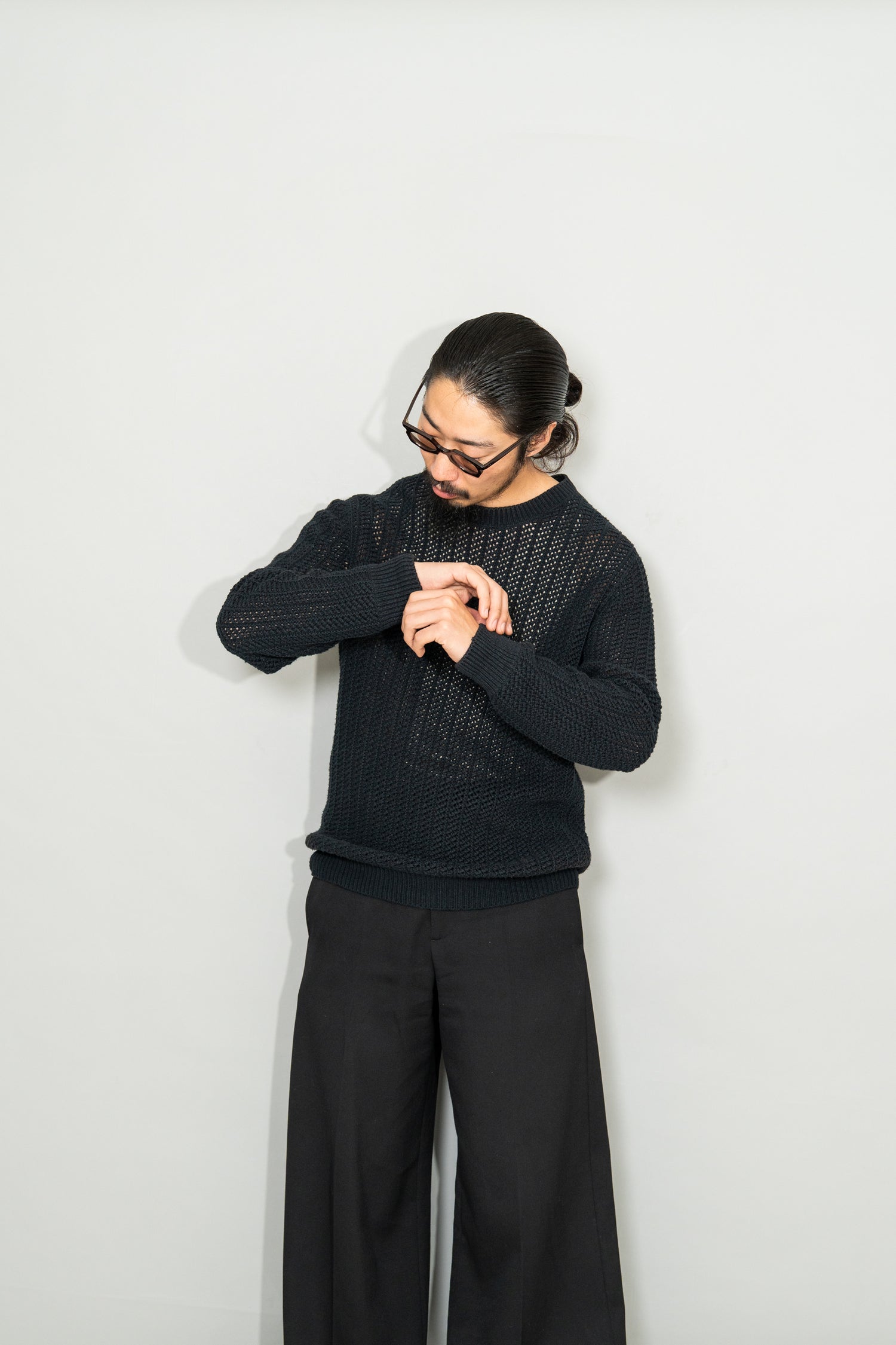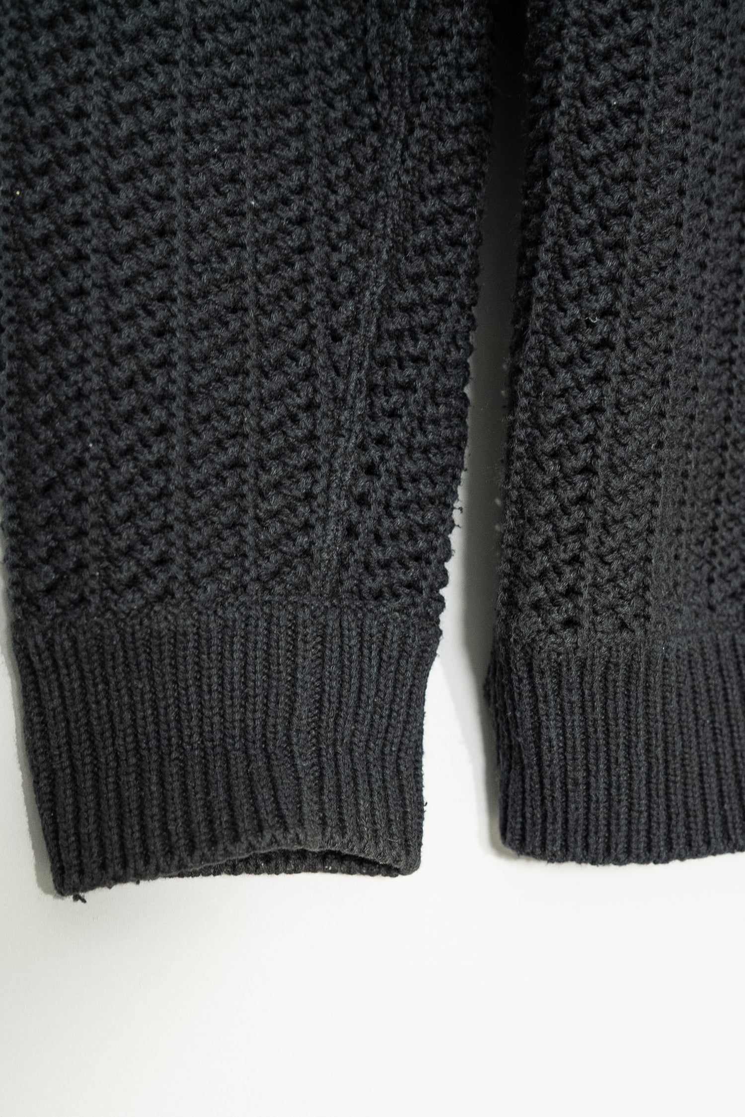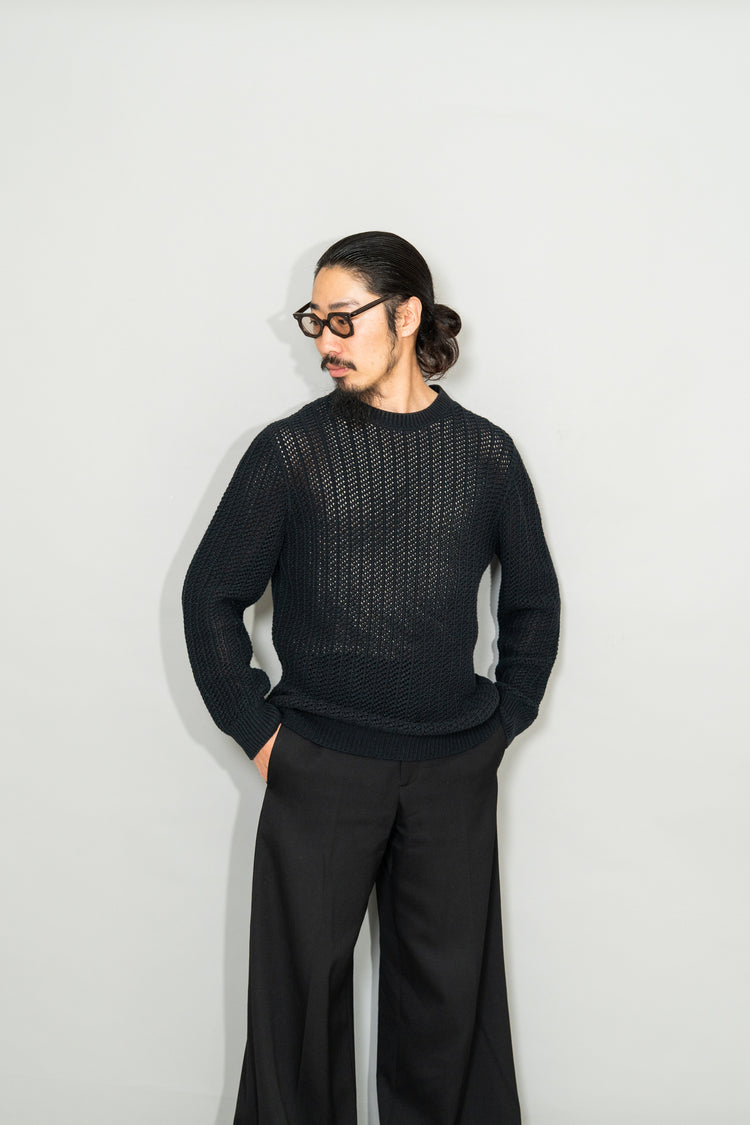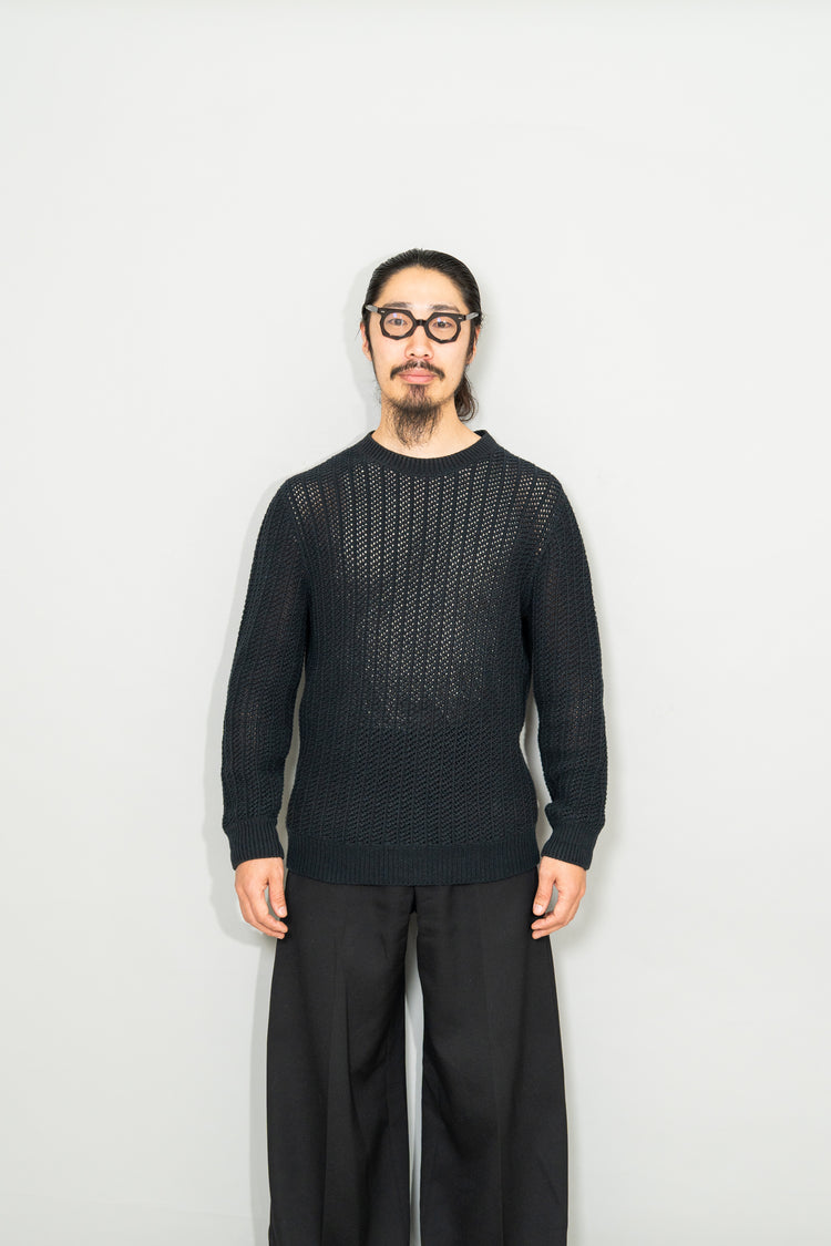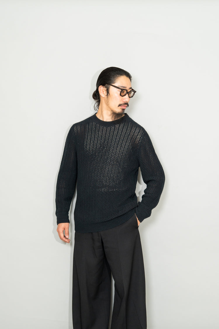 ブラックカラーをまとった本作は、一見シンプルながらも、編み構造により立体感のあるメッシュ調のデザインを採用している点が最大の魅力。編み目が細かく上品で、インナーとのレイヤード次第で表情が変わる奥深い一着です。通気性が高く、軽快な着心地でありながら、しっかりとした編み立てによって高級感を保っています。エルメスの大胆さとミニマリズムを調和させたデザインは、派手さを求めずとも存在感を放ちはじめ、まさに“大人のためのラグジュアリー”を体現しています。