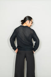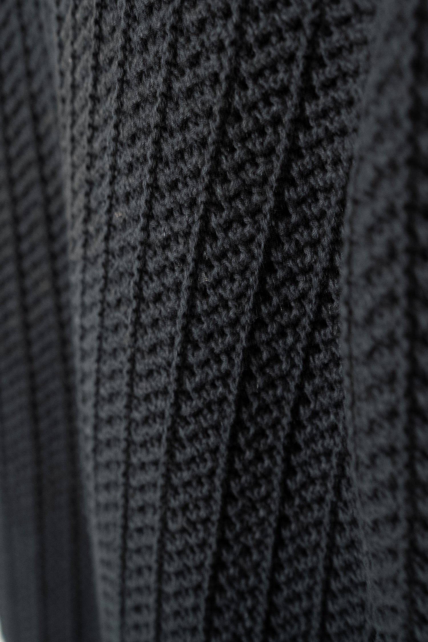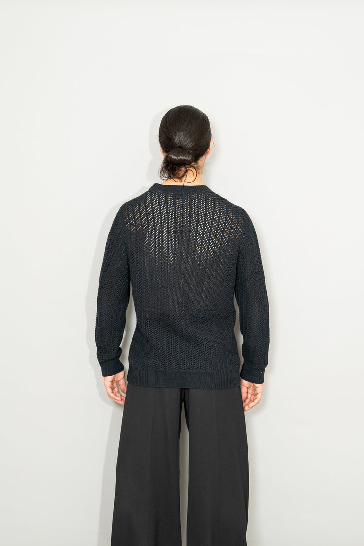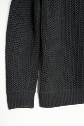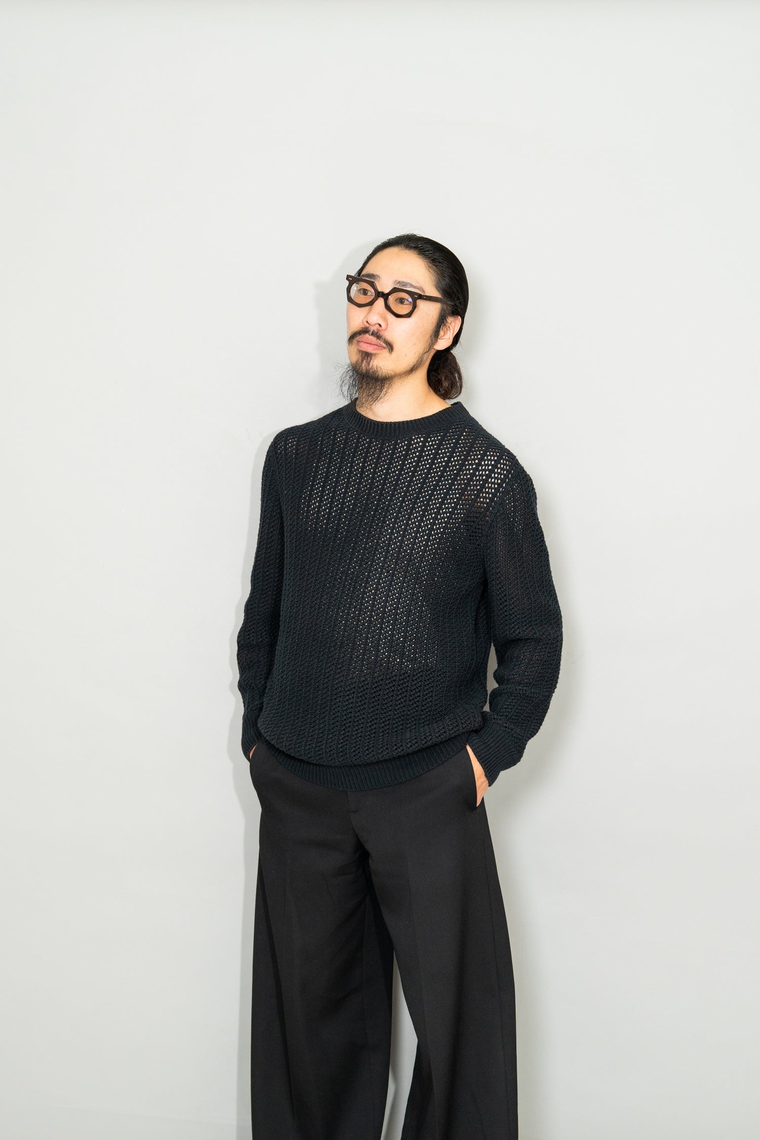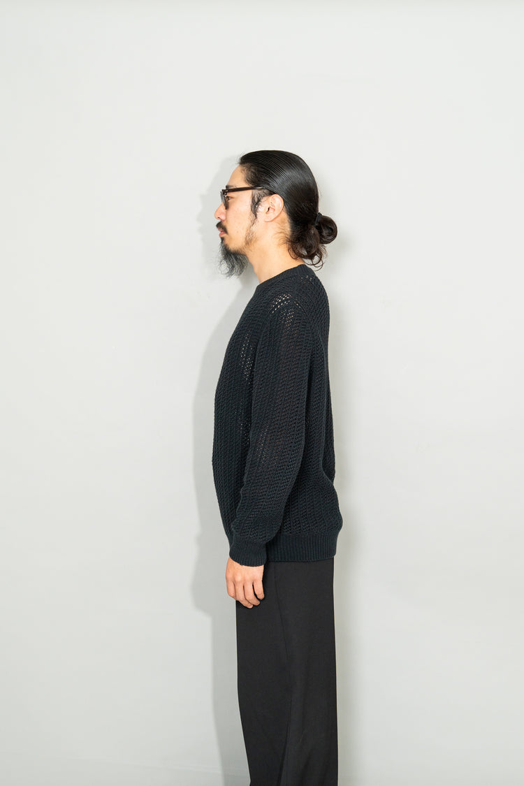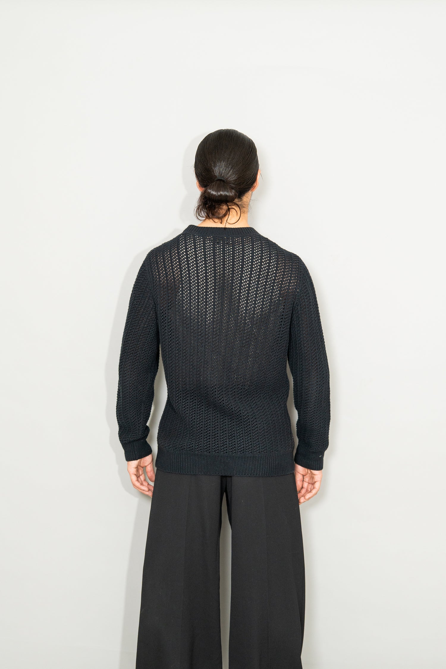 ブラックカラーをまとった本作は、一見シンプルながらも、編み構造により立体感のあるメッシュ調のデザインを採用している点が最大の魅力。編み目が細かく上品で、インナーとのレイヤード次第で表情が変わる奥深い一着です。通気性が高く、軽快な着心地でありながら、しっかりとした編み立てによって高級感を保っています。エルメスの大胆さとミニマリズムを調和させたデザインは、派手さを求めずとも存在感を放ちはじめ、まさに“大人のためのラグジュアリー”を体現しています。