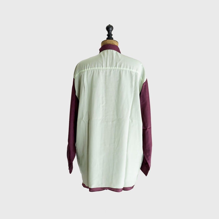 フィルザビルのキュプラレイヤードシャツ。なめらかな肌触りと上品な光沢感があり、夏場でも快適に着用いただけます。2重仕立てで、身頃の色が混ざり合い透け感のある独特の雰囲気がある1枚です。程よいオーバーサイズの為ゆったりとラフに着こなせるアイテム。