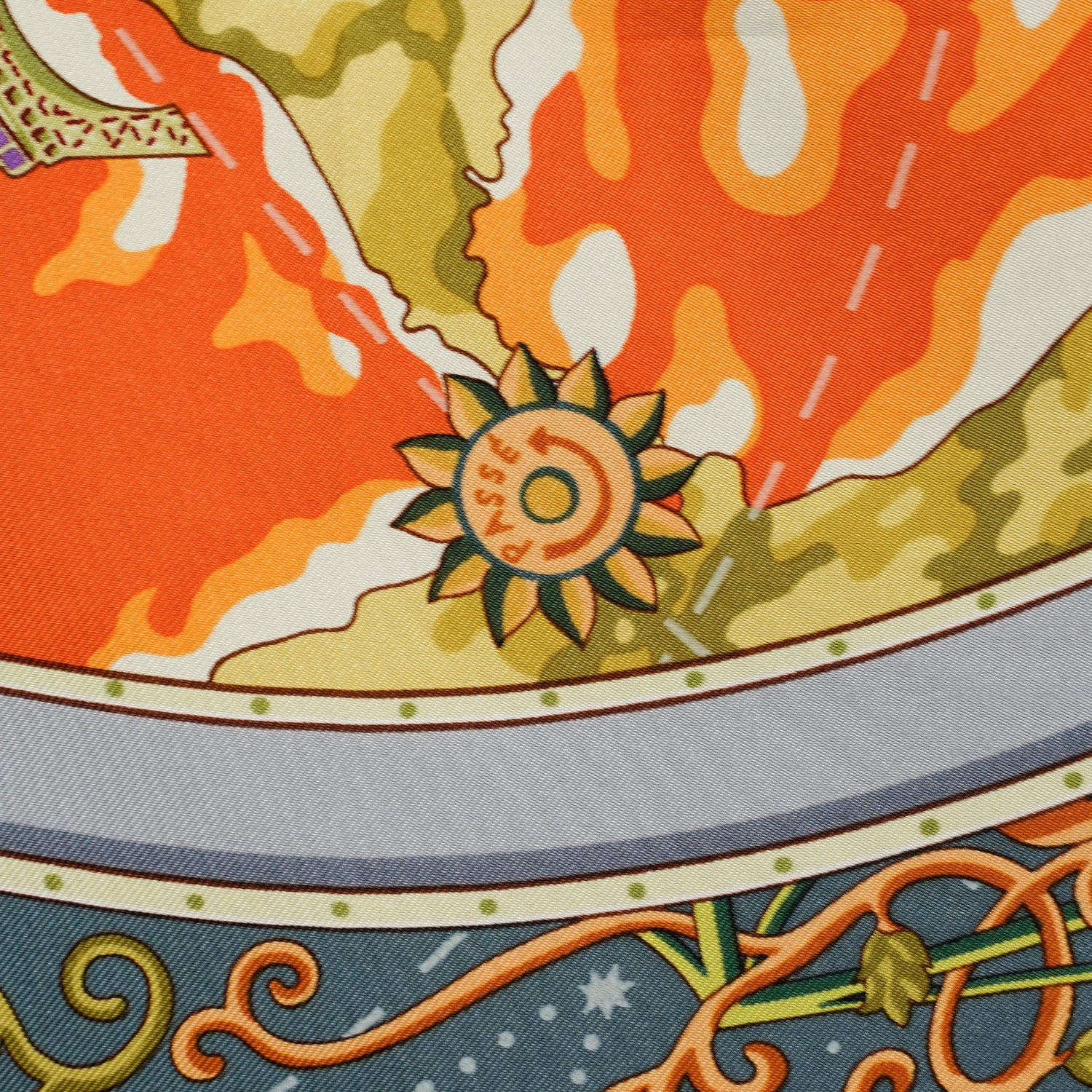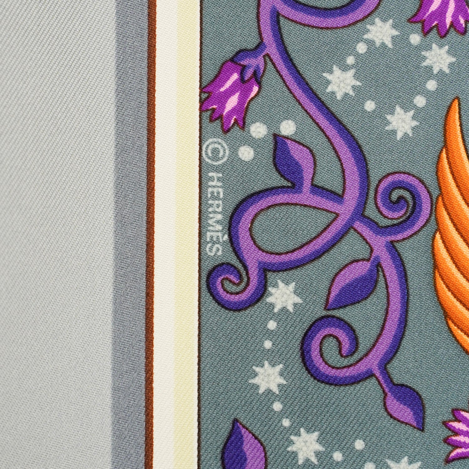 デザイン毎にデッサンをおこし、一色に対して版を作成、色を決定し、職人により丁寧に染色作業が行われ、仕上げの縁取りまで手縫いで作られているHERMESのカレ。