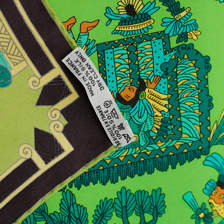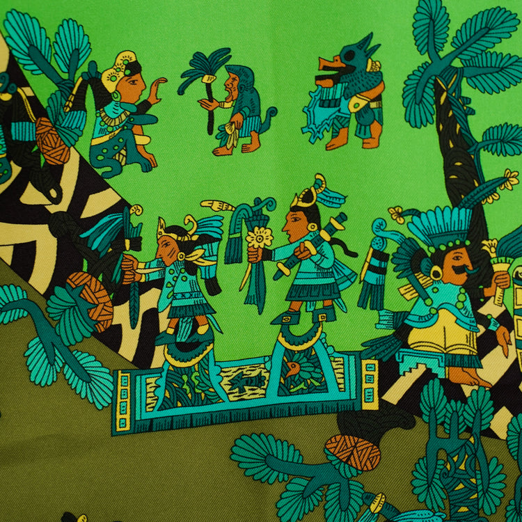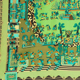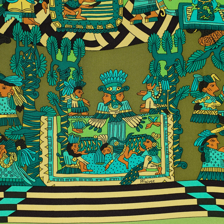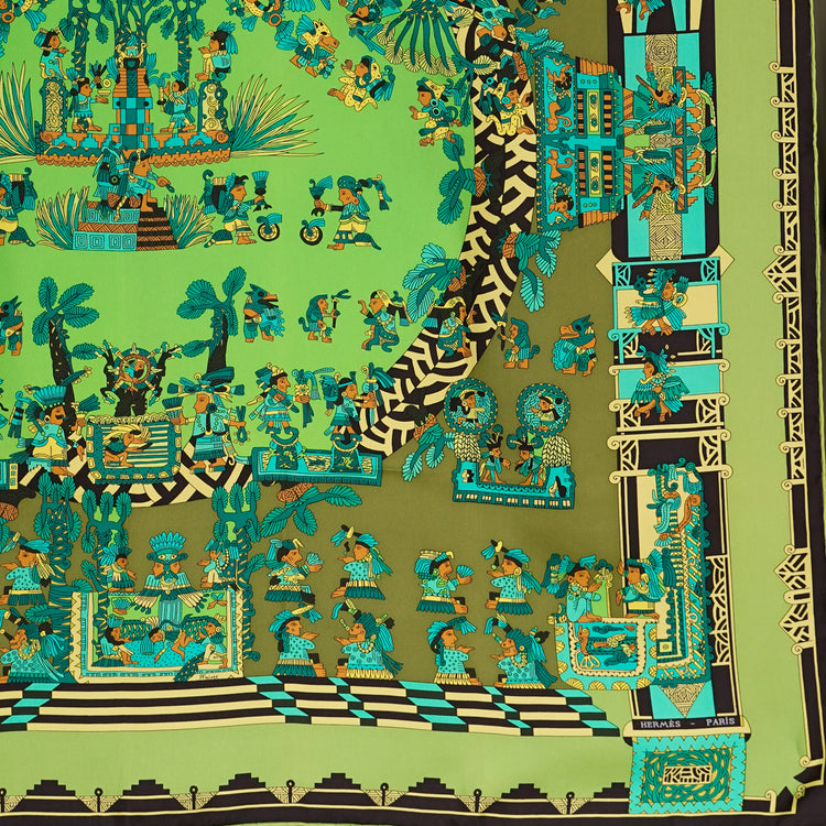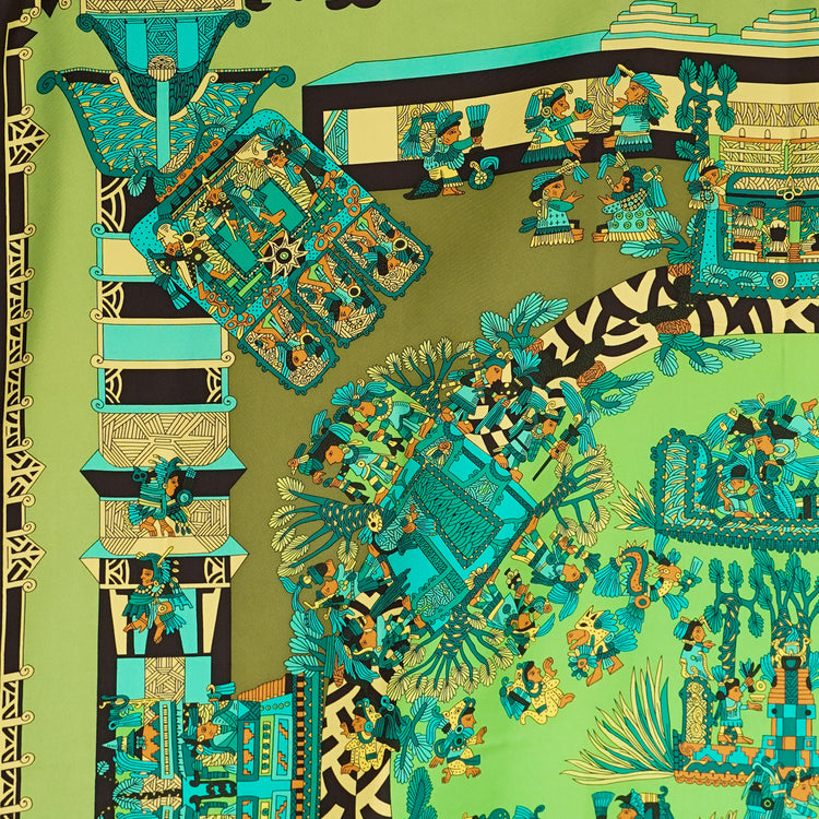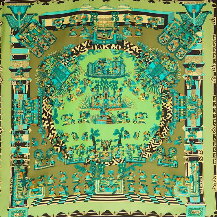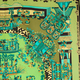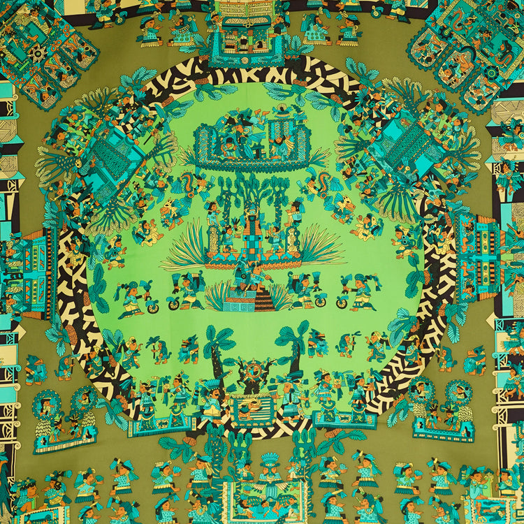 デザイン毎にデッサンをおこし、一色に対して版を作成、色を決定し、職人により丁寧に染色作業が行われ、仕上げの縁取りまで手縫いで作られているHERMESのカレ。