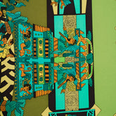 カレ一枚に対し平均25色が使われており、多いものでは40色以上の色彩がこの90cm四方に描かれ、一色毎に版を作り、プリントではなく染色の作業を行なっております。
