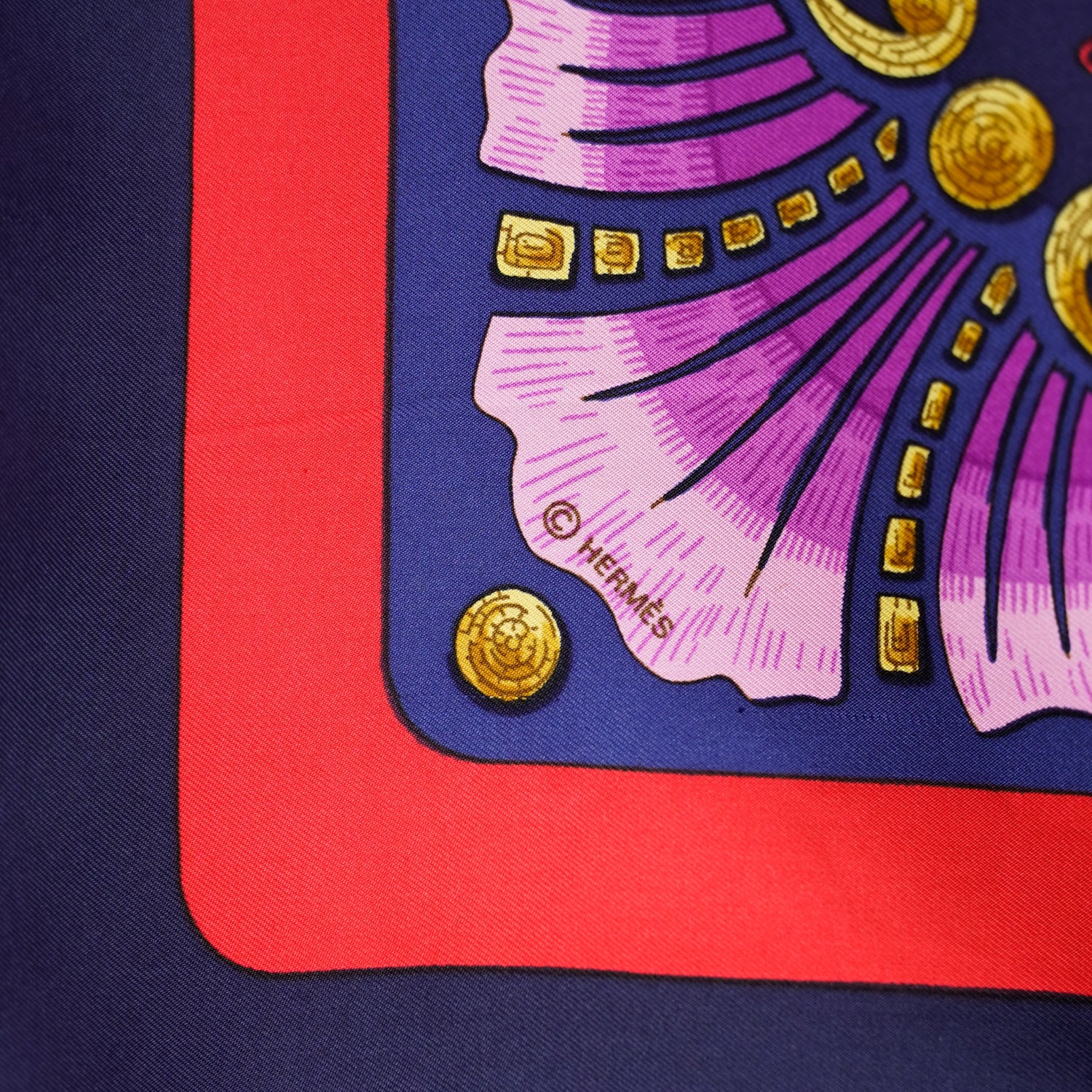 デザイン毎にデッサンをおこし、一色に対して版を作成、色を決定し、職人により丁寧に染色作業が行われ、仕上げの縁取りまで手縫いで作られているHERMESのカレ。