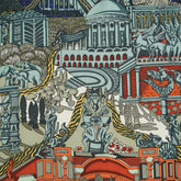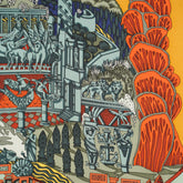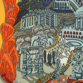 カレ一枚に対し平均25色が使われており、多いものでは40色以上の色彩がこの90cm四方に描かれ、一色毎に版を作り、プリントではなく染色の作業を行なっております。
