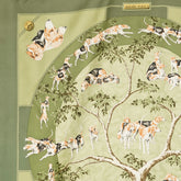 デザイン毎にデッサンをおこし、一色に対して版を作成、色を決定し、職人により丁寧に染色作業が行われ、仕上げの縁取りまで手縫いで作られているHERMESのカレ。