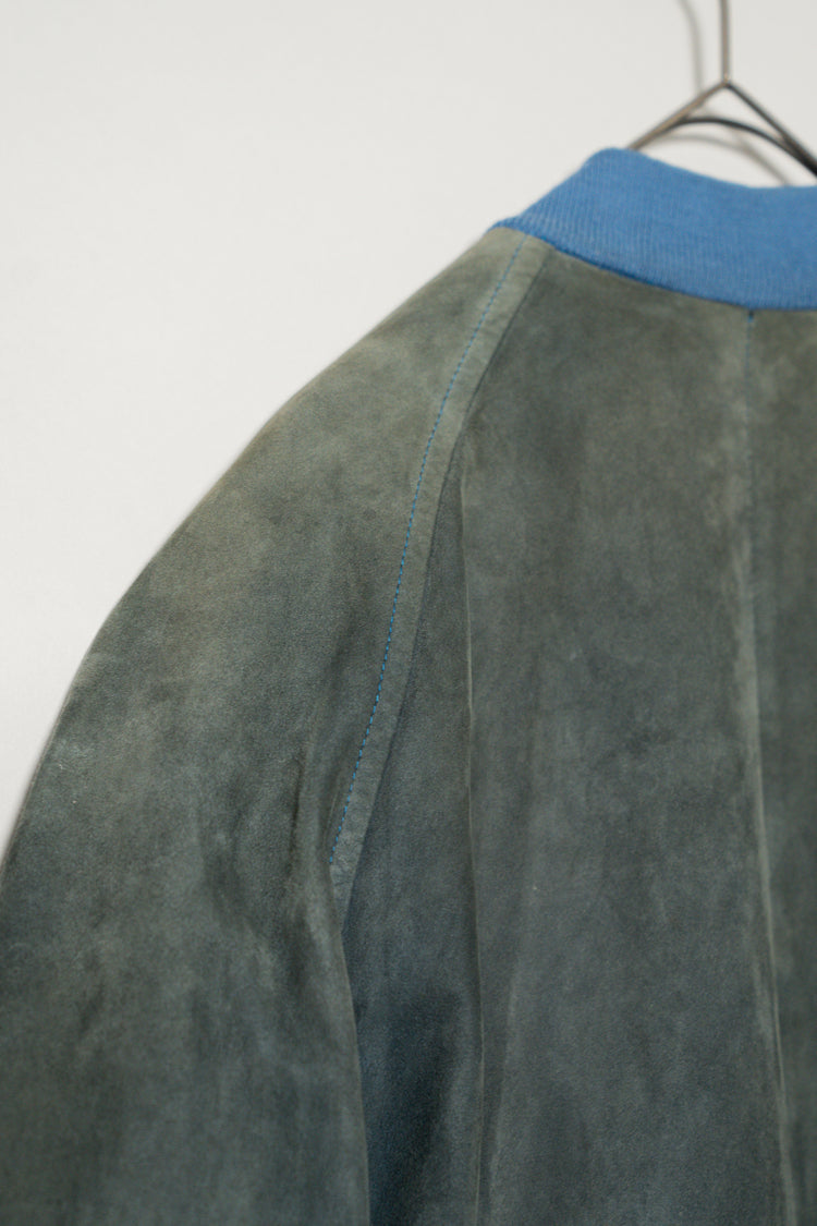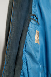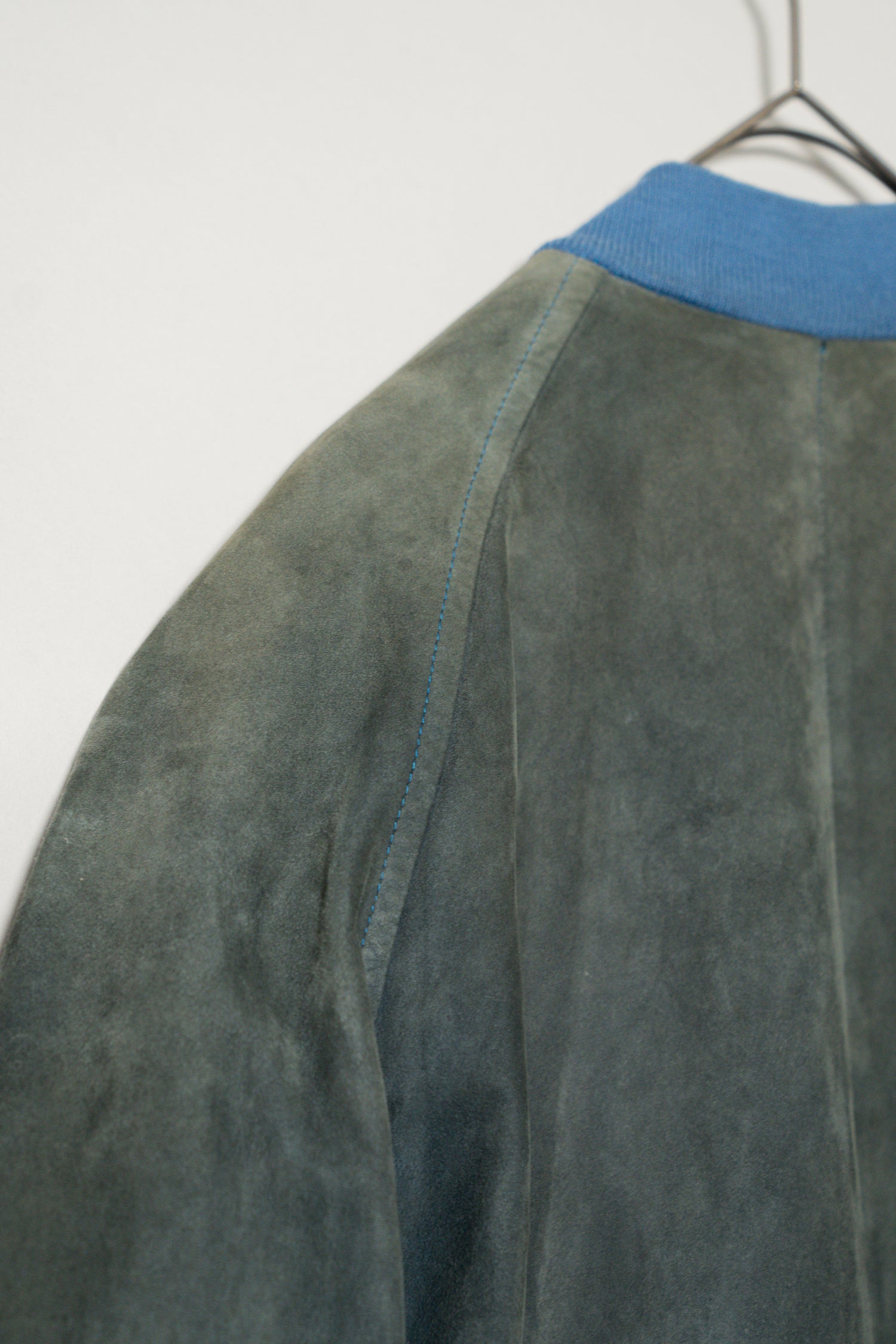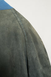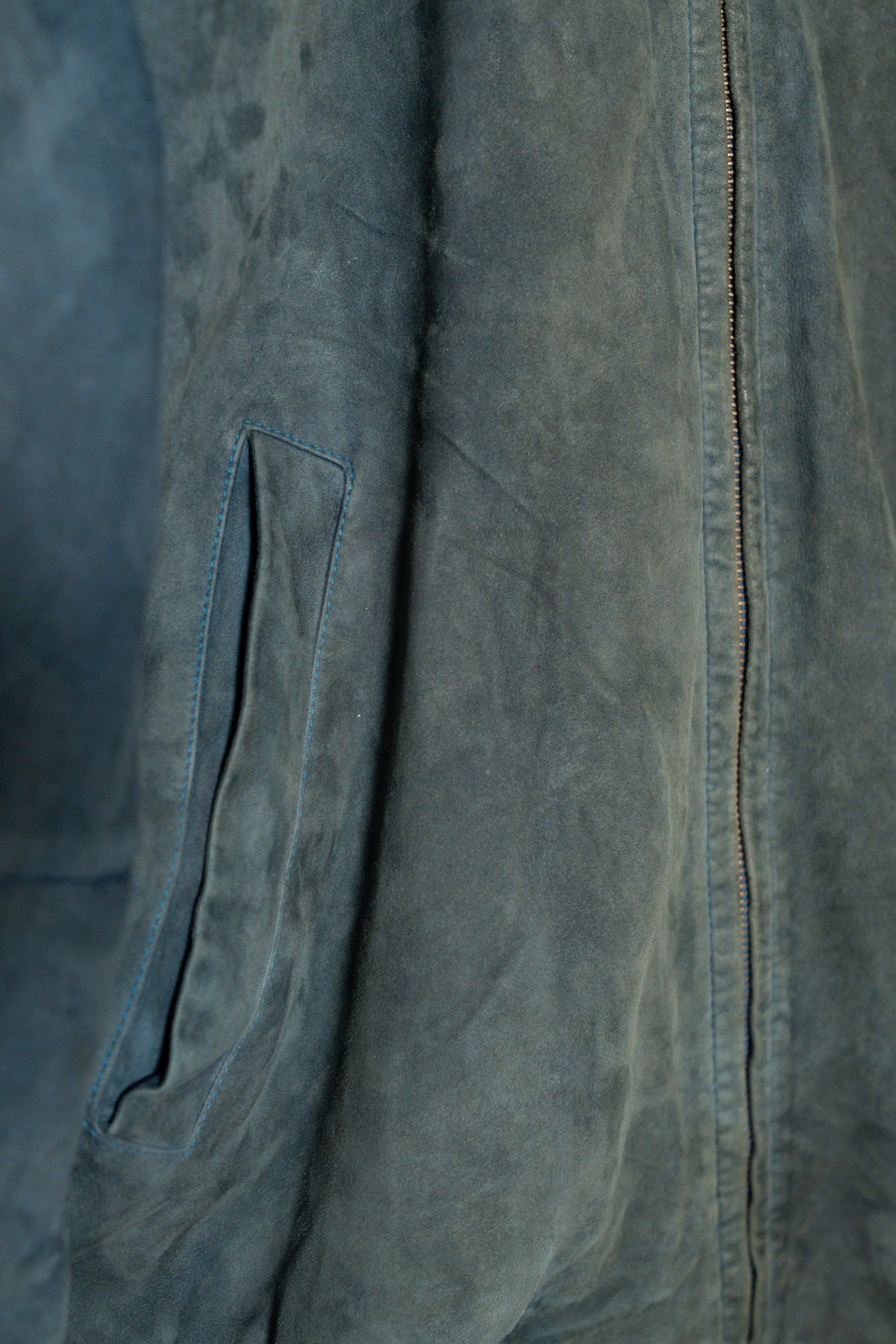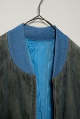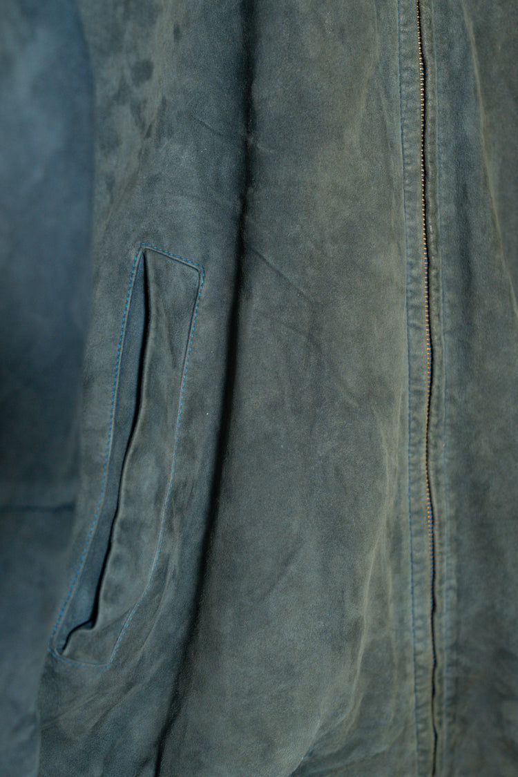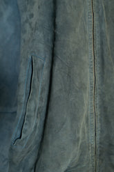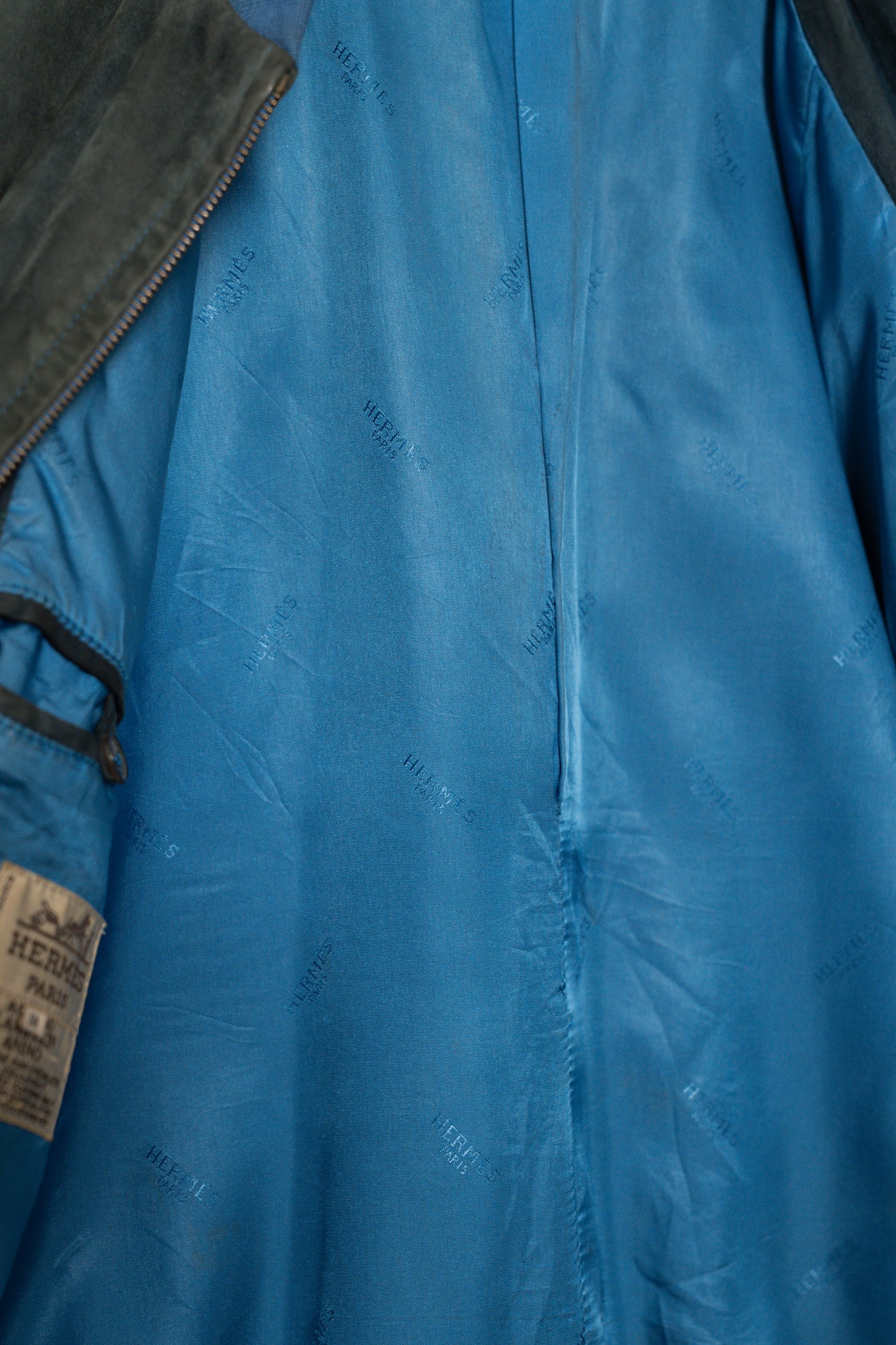 深みのあるブルーグレーの色調が印象的なこちらのブルゾンは、エルメスのアトリエが誇る最高峰のクラフツマンシップを感じさせる一着です。表地には柔らかく鞣されたラムスキンのスウェードレザーを採用し、着る人の身体に沿うように優しく馴染んでいきます。退色したような表情は、まるで時間をかけて自然に風合いが育ったかのような味わいを持ち、ビンテージならではの奥行きを感じさせます。表面のわずかなムラ感や陰影は、素材そのものが持つ生命力を映し出しており、ひとつとして同じ表情を持つものはありません。