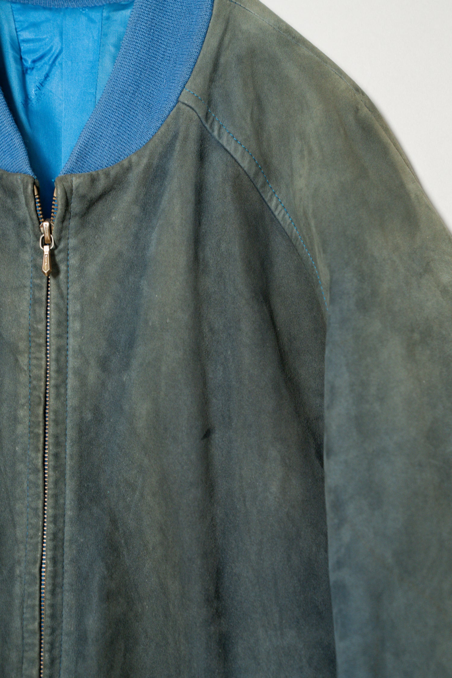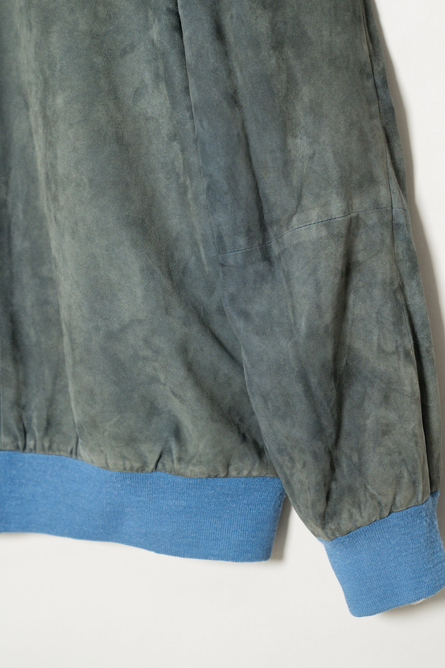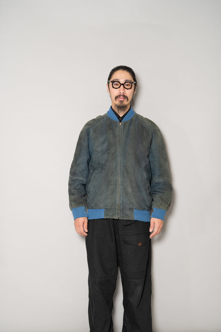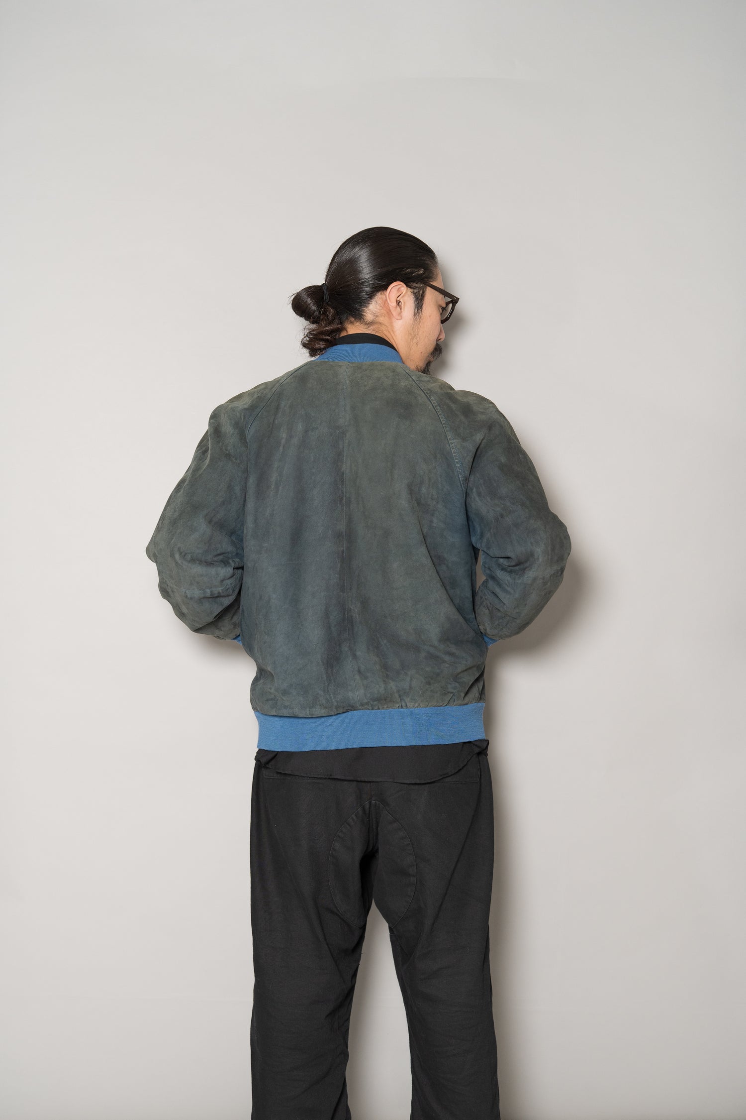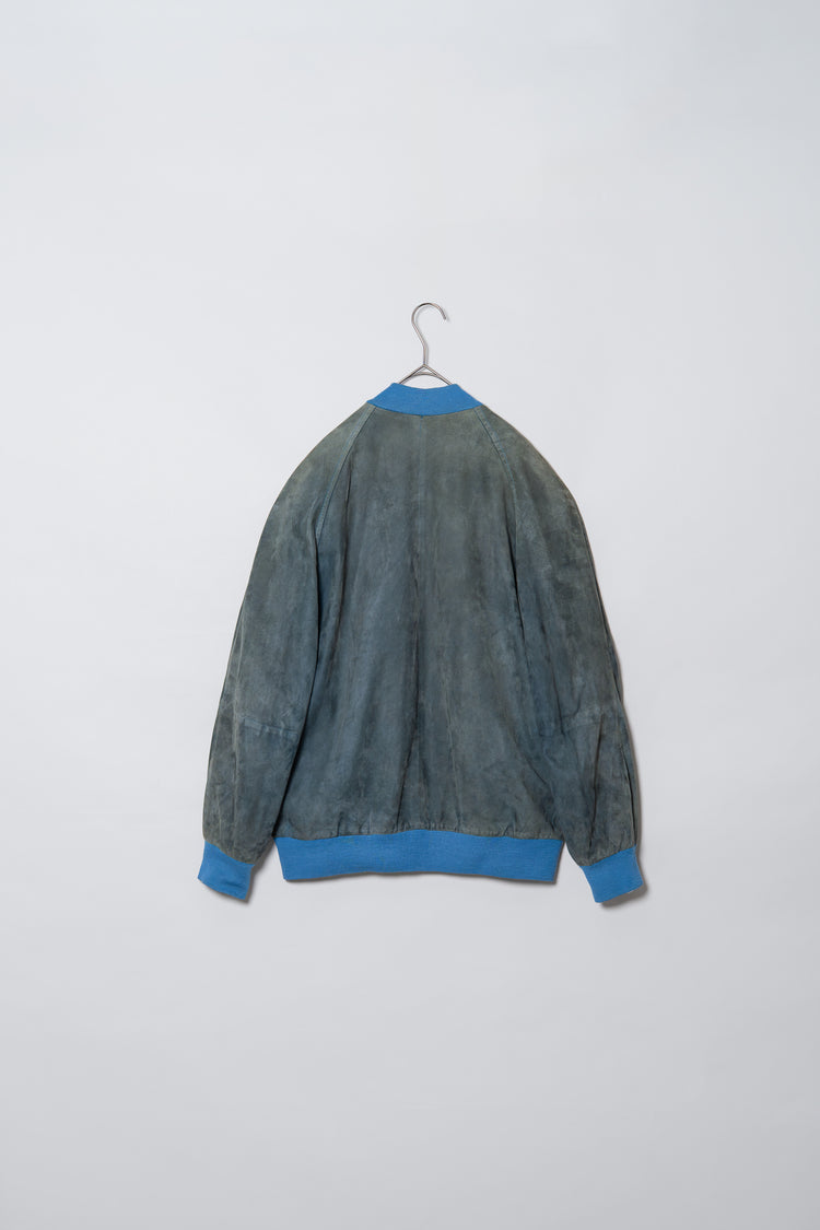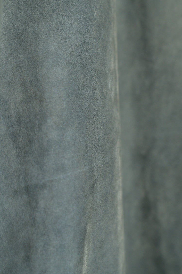 深みのあるブルーグレーの色調が印象的なこちらのブルゾンは、エルメスのアトリエが誇る最高峰のクラフツマンシップを感じさせる一着です。表地には柔らかく鞣されたラムスキンのスウェードレザーを採用し、着る人の身体に沿うように優しく馴染んでいきます。退色したような表情は、まるで時間をかけて自然に風合いが育ったかのような味わいを持ち、ビンテージならではの奥行きを感じさせます。表面のわずかなムラ感や陰影は、素材そのものが持つ生命力を映し出しており、ひとつとして同じ表情を持つものはありません。