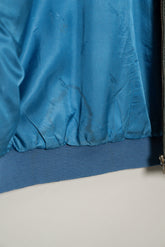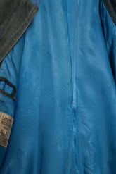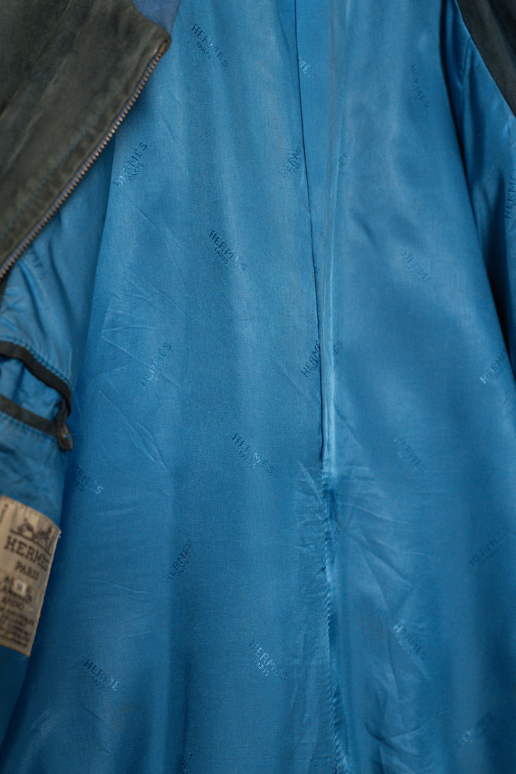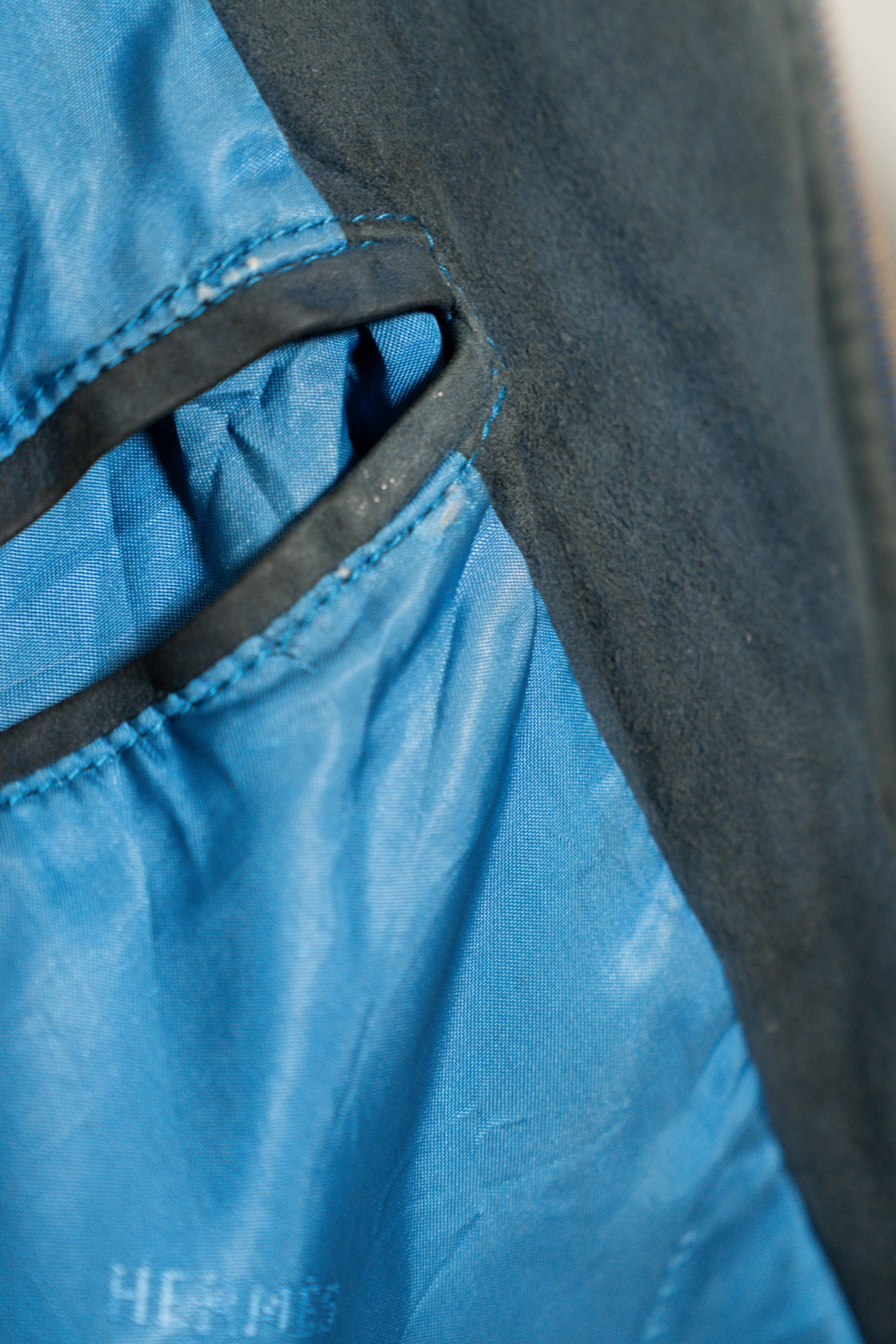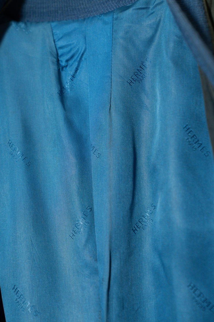 フロントのファスナーはスイスの名門「riri」製。世界でも限られたブランドのみが使用を許される高品質ジップであり、その滑らかな開閉感と金属の重みが、細部に宿る贅沢を感じさせます。裏地にはエルメスのロゴが織り込まれたアセテート生地が使用され、動くたびにわずかに光を反射して、見えない部分にまで気品を漂わせます。ブルーのライニングが表地と呼応するように配置されており、袖を通した瞬間に感じる統一感は、まさにエルメスならではの設計です。