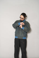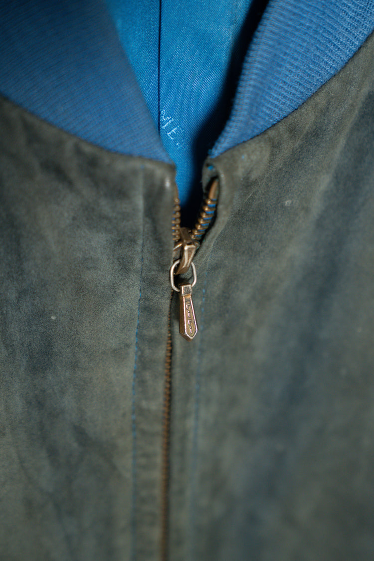襟や裾、袖口のリブには鮮やかなブルーが配され、くすんだスウェードとのコントラストが絶妙です。このブルーは単なる差し色ではなく、エルメスが得意とする「色の調和」へのこだわりを象徴しています。控えめでありながらも確実に印象に残る配色は、シンプルなブルゾンに知的な印象と上質な遊び心を添えています。