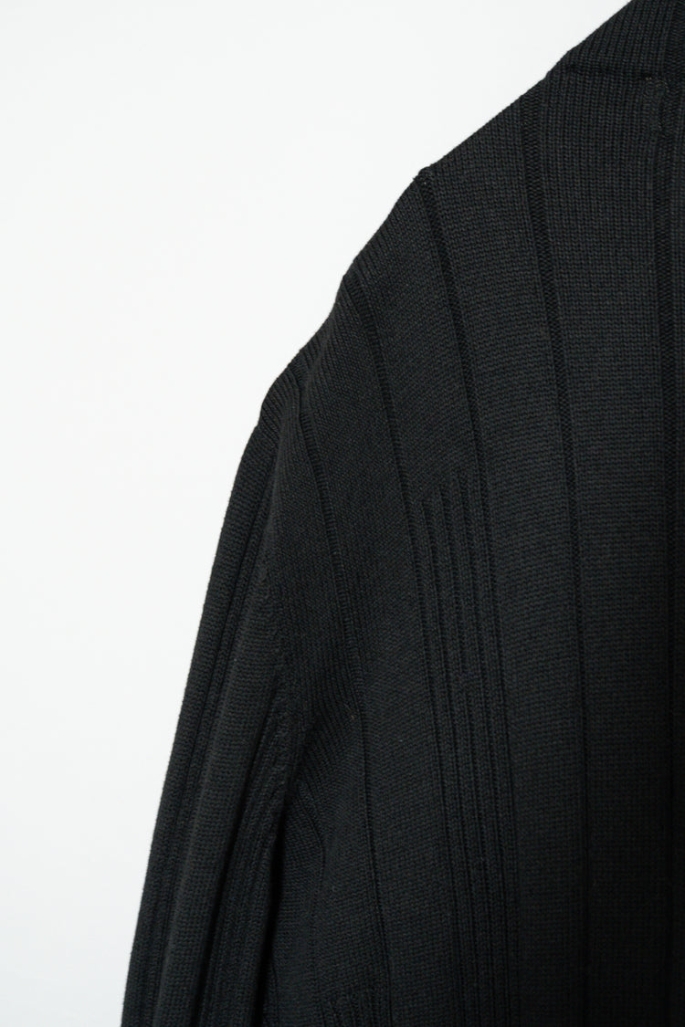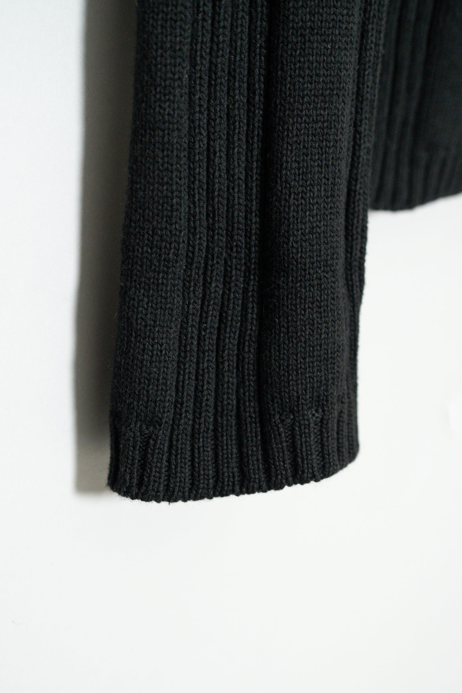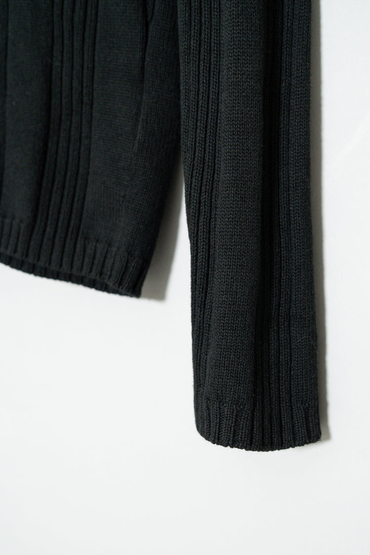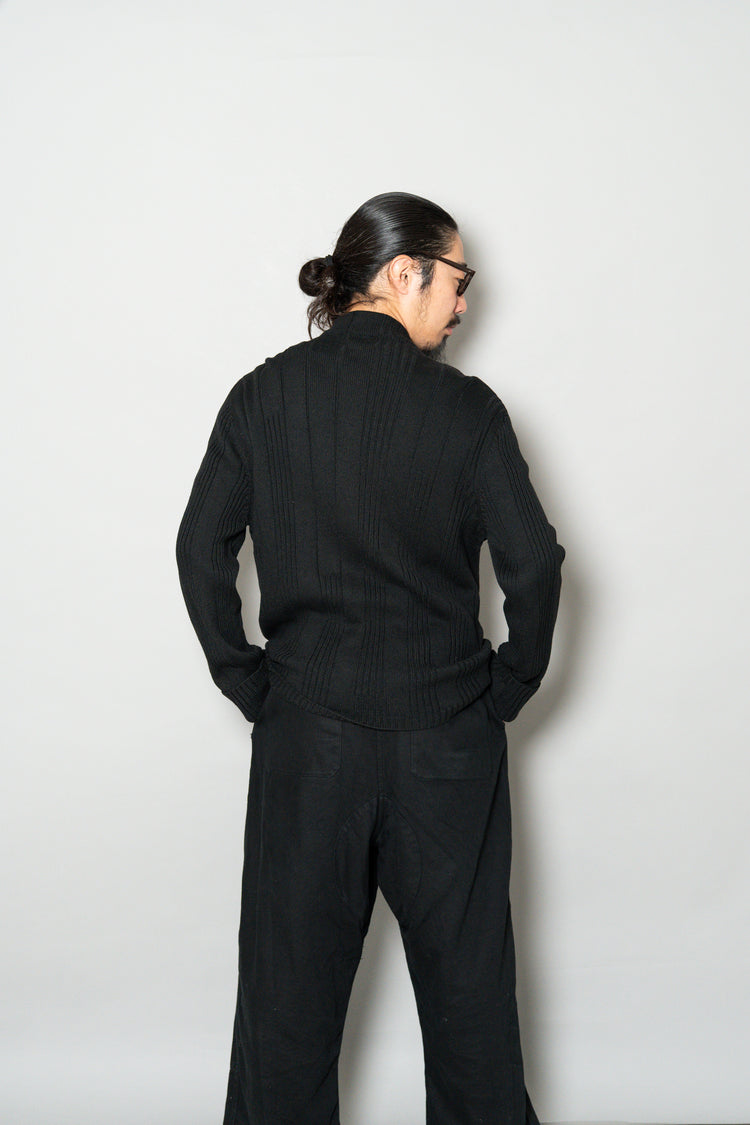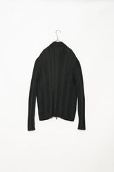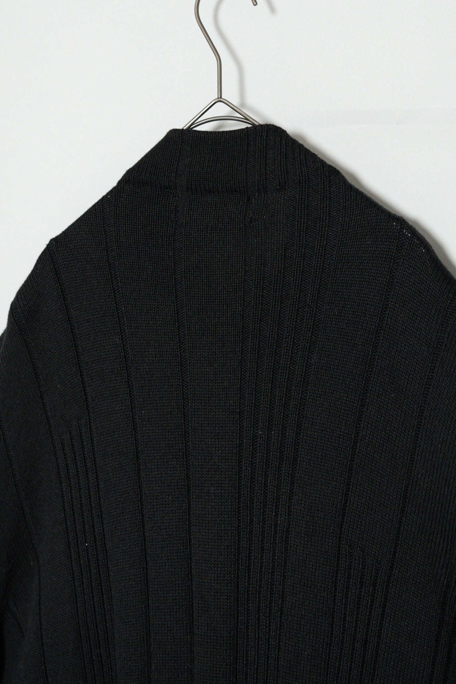 最大の特徴は、上質なメリノウールを用いた重厚感のあるリブ編み。メリノウールは繊維が非常に細く、肌触りが滑らかでチクチクしにくいのが特徴ですが、本作ではその中でもしっかりと目の詰まった編地が採用されており、見た目の存在感と防寒性を高次元で両立しています。リブの縦ラインは視覚的にも縦を強調し、着用時に美しいシルエットを生み出します。
