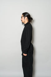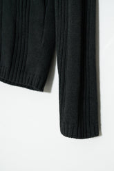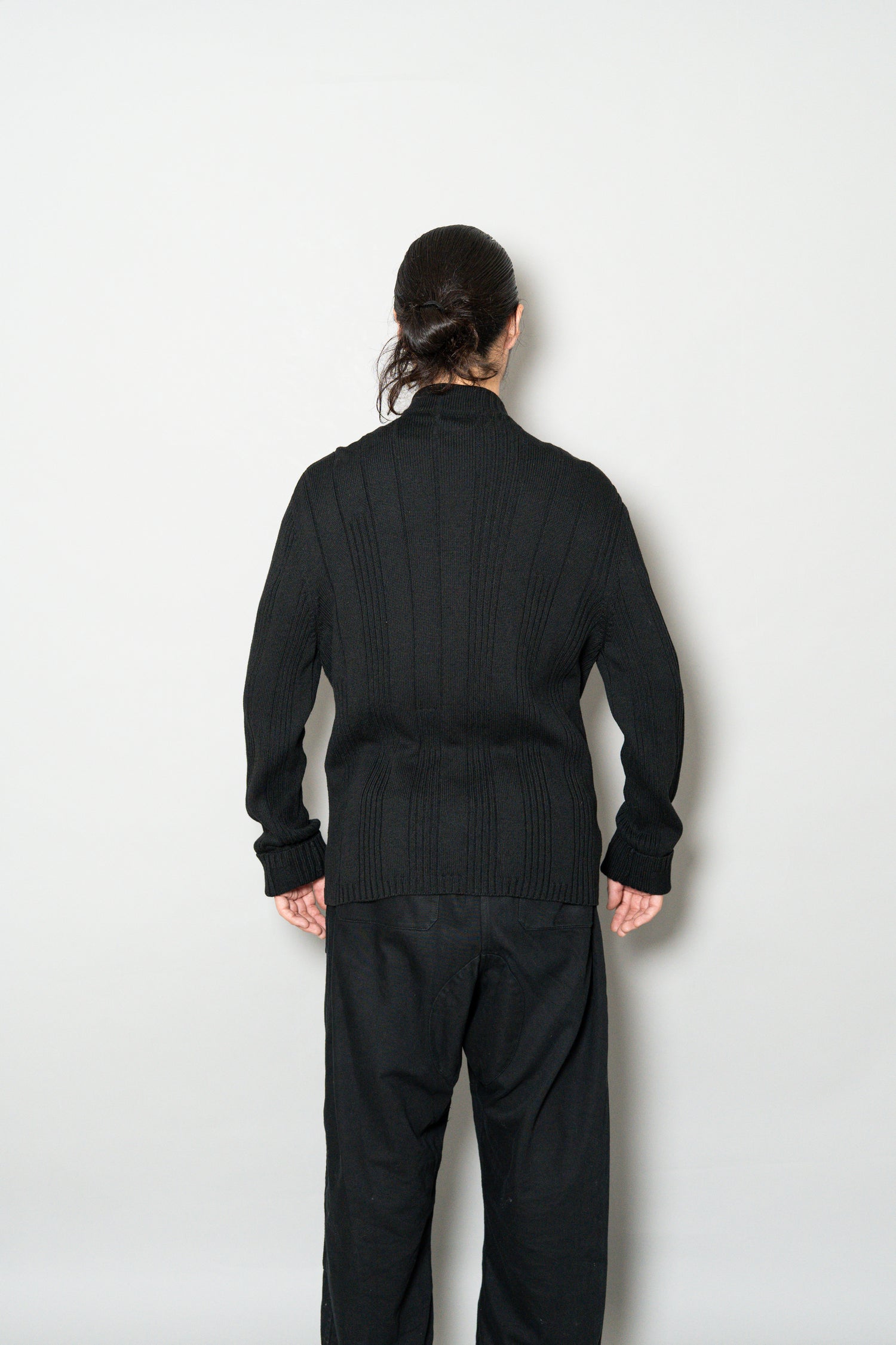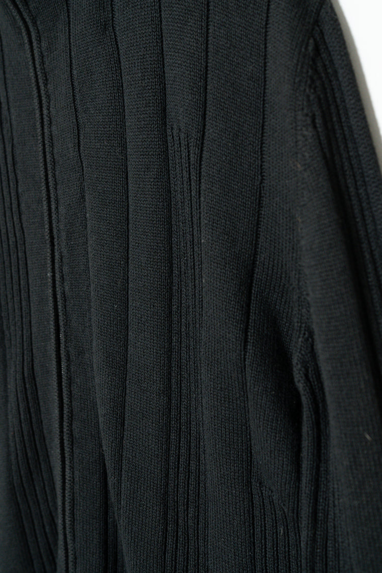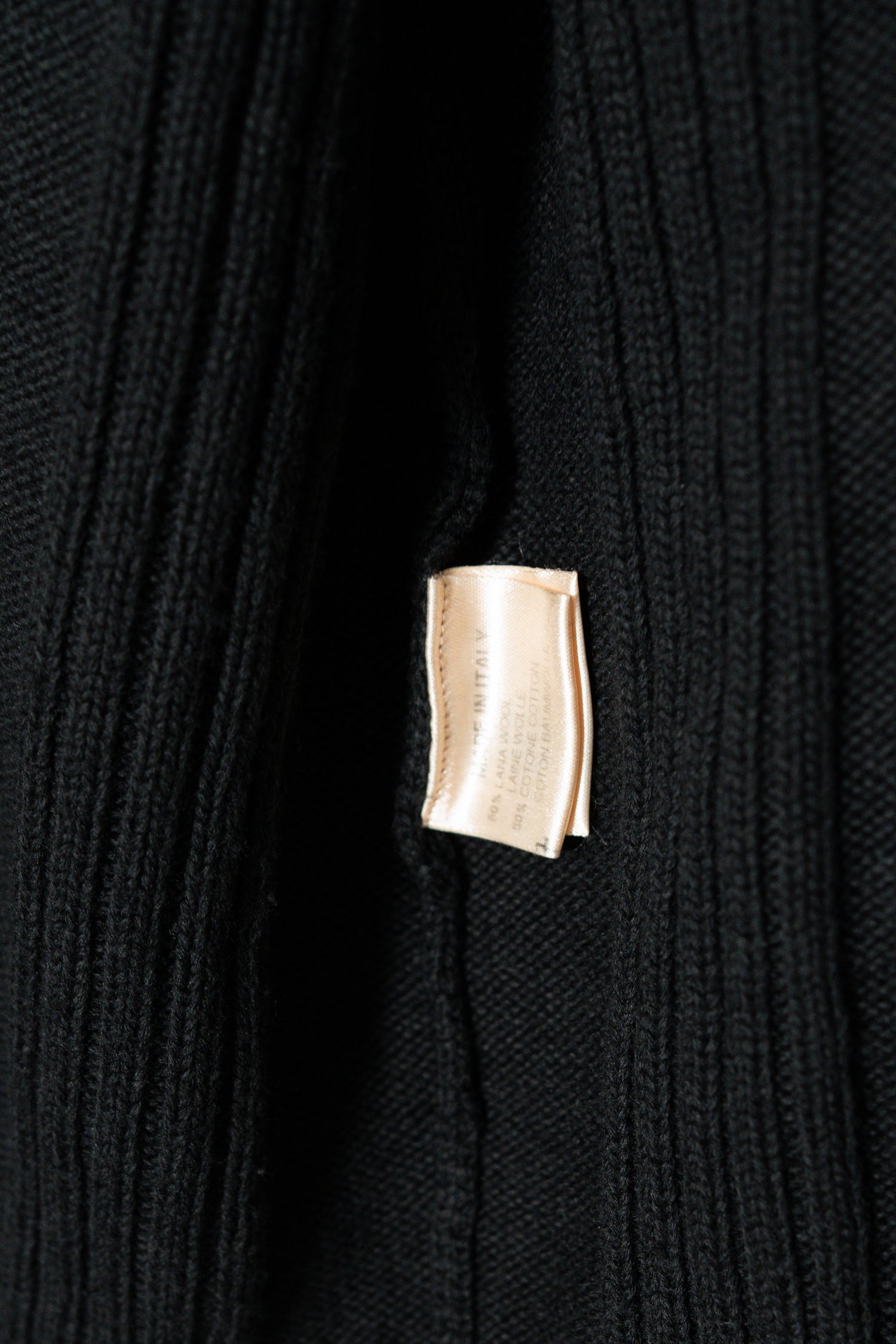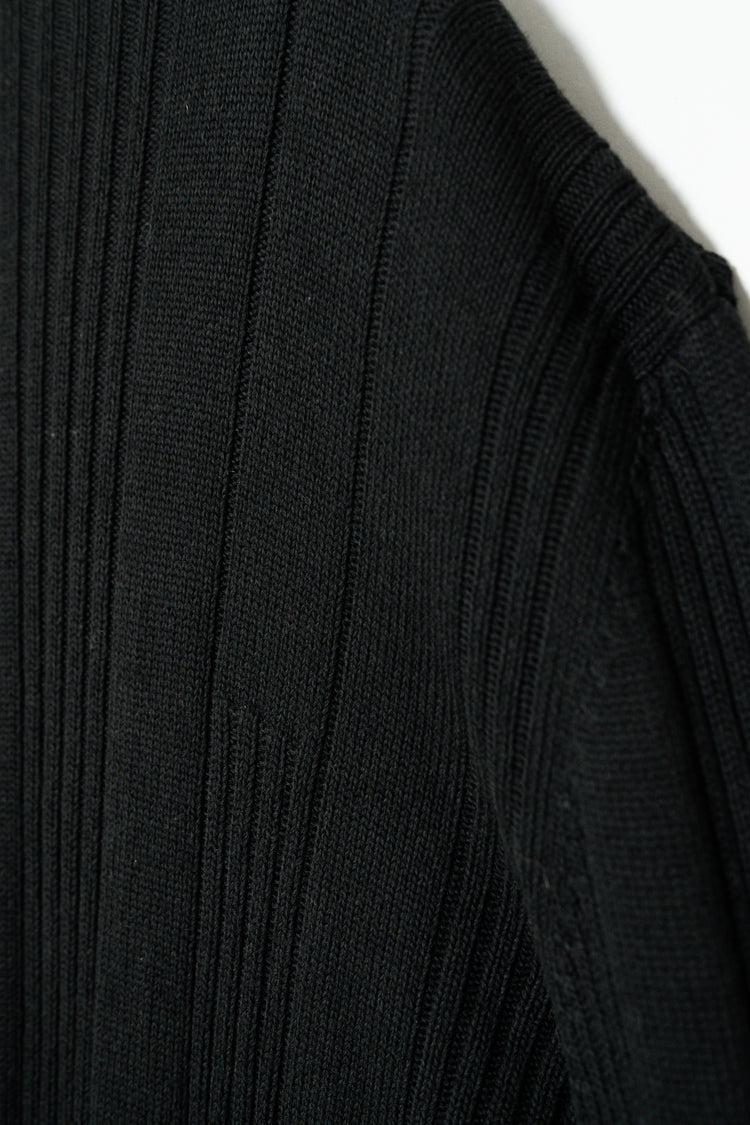 最大の特徴は、上質なメリノウールを用いた重厚感のあるリブ編み。メリノウールは繊維が非常に細く、肌触りが滑らかでチクチクしにくいのが特徴ですが、本作ではその中でもしっかりと目の詰まった編地が採用されており、見た目の存在感と防寒性を高次元で両立しています。リブの縦ラインは視覚的にも縦を強調し、着用時に美しいシルエットを生み出します。