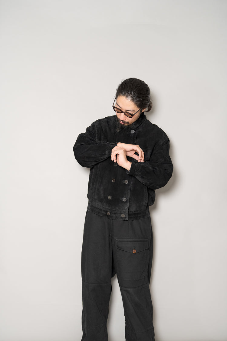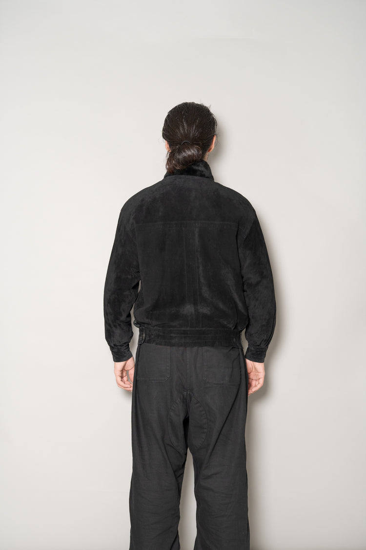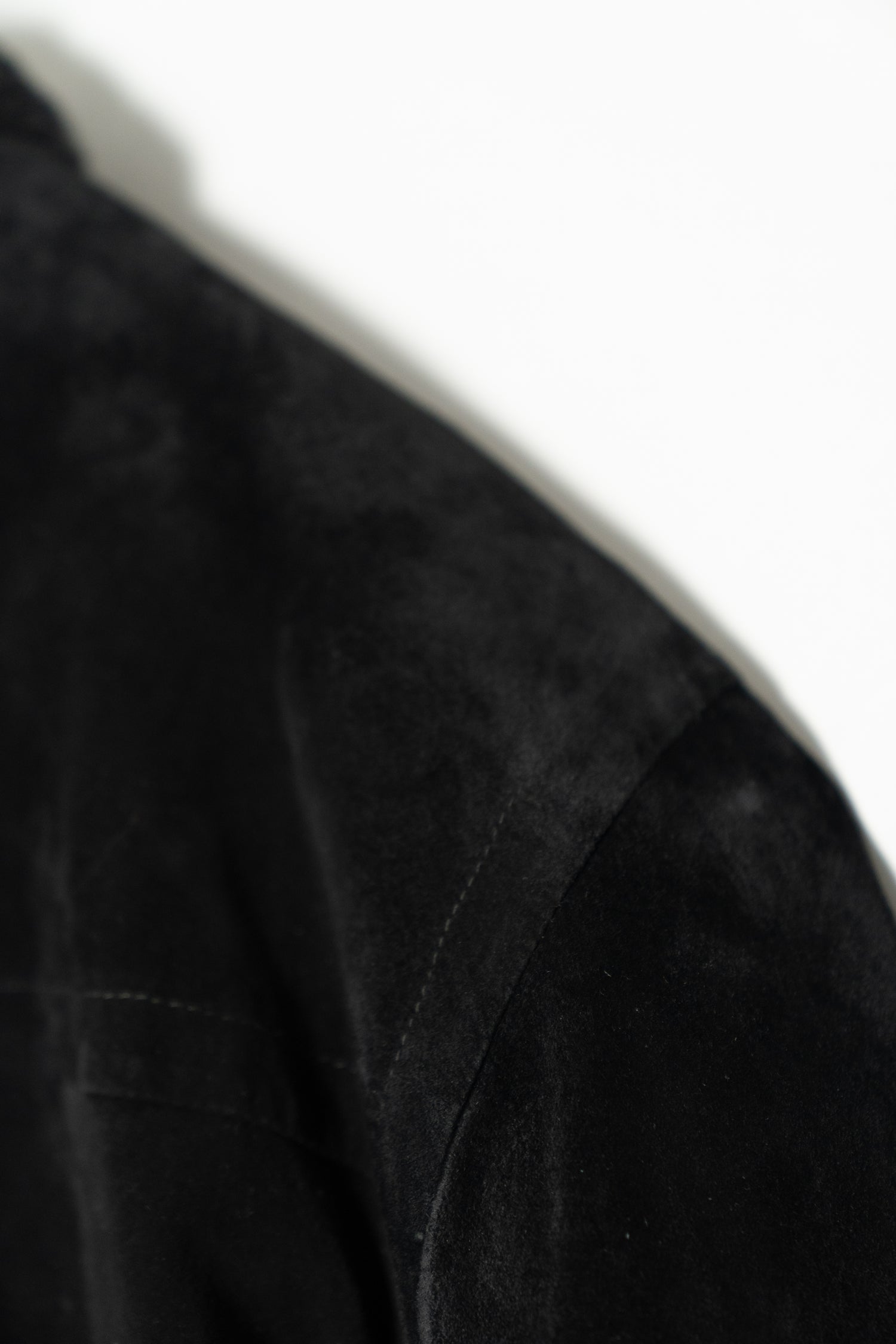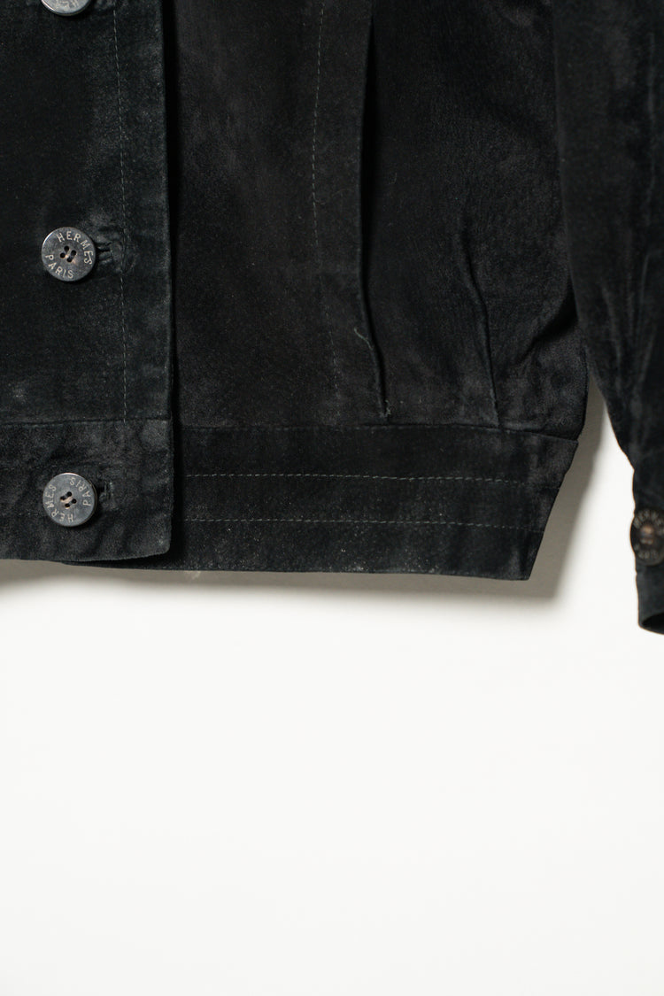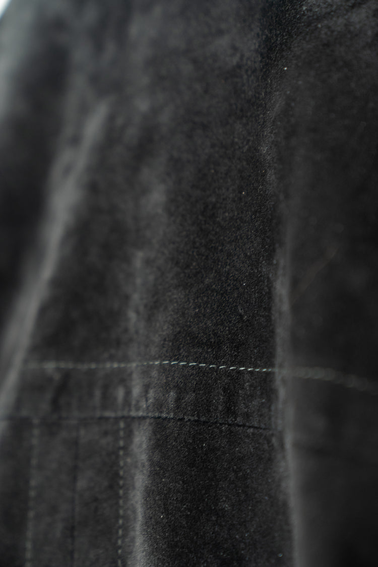 このジャケットは、エルメスが誇るレザーワークの真髄を体現する一着です。素材には、ラグジュアリーブランドの中でもほとんど用いられることのない「ピッグスキン(豚革)」を採用。上質な素材ながら非常に扱いが難しいことで知られ、熟練した職人の手でしか仕立てられない特別なレザーです。表面を丁寧にスウェード調へと仕上げることで、深いマットブラックの質感が生まれ、光を受ける角度でわずかに艶を帯びる独特の陰影が現れます。まさに、使い込むほどにその表情を変えていく「育つ革」。HERMÈS が長年培ってきた素材哲学が息づいています。