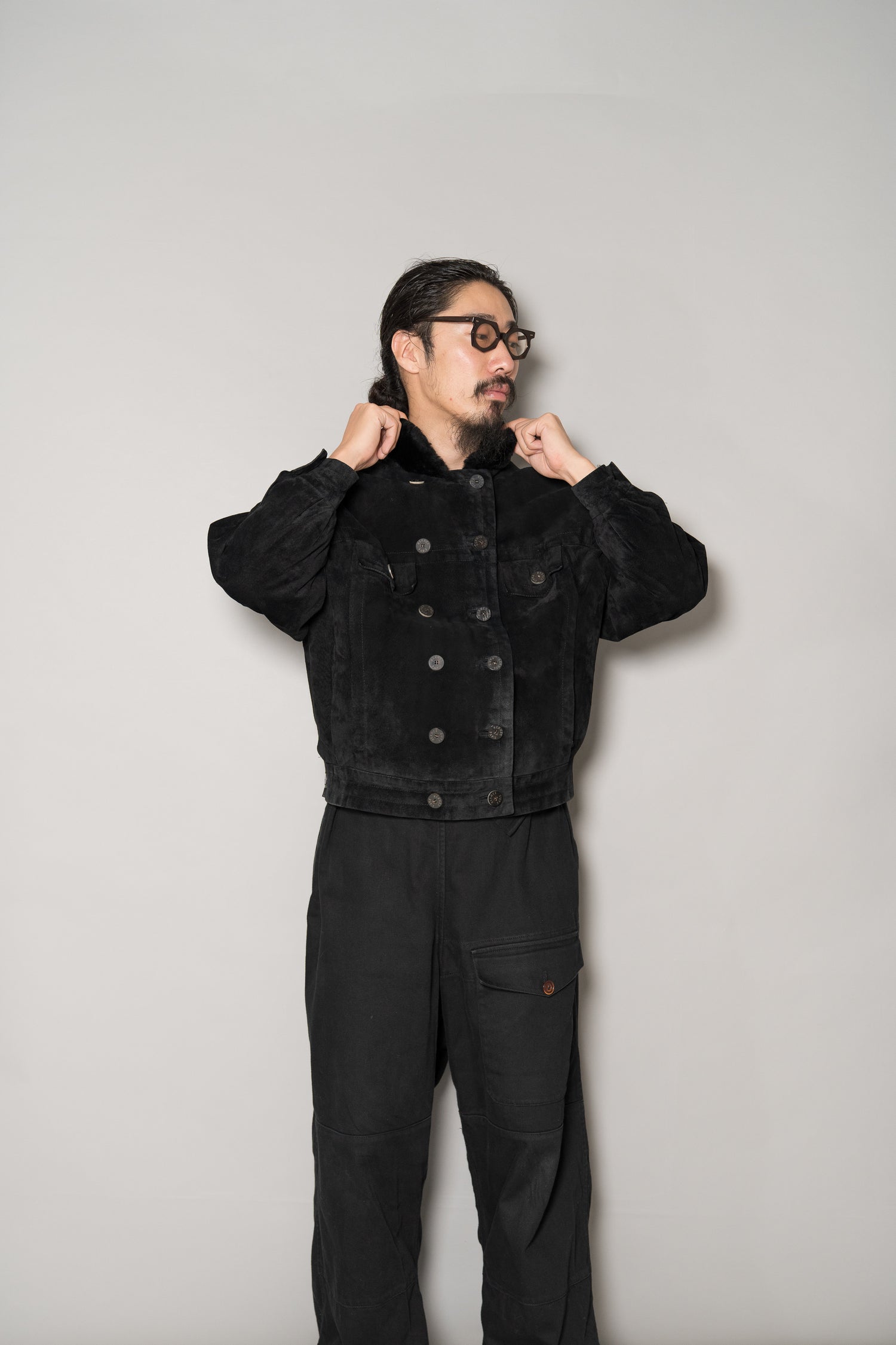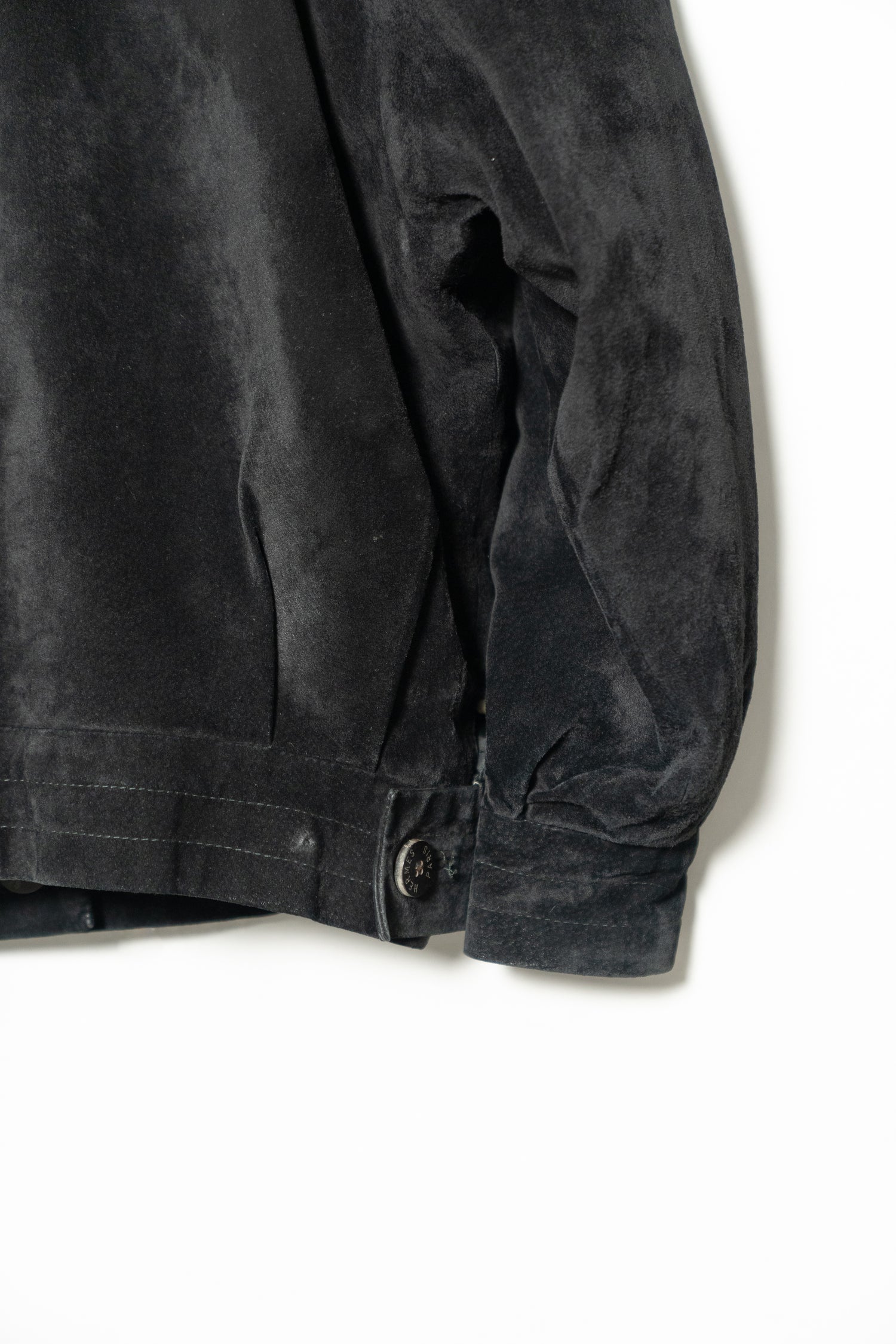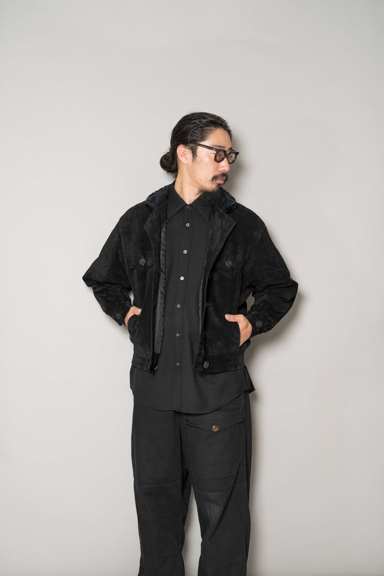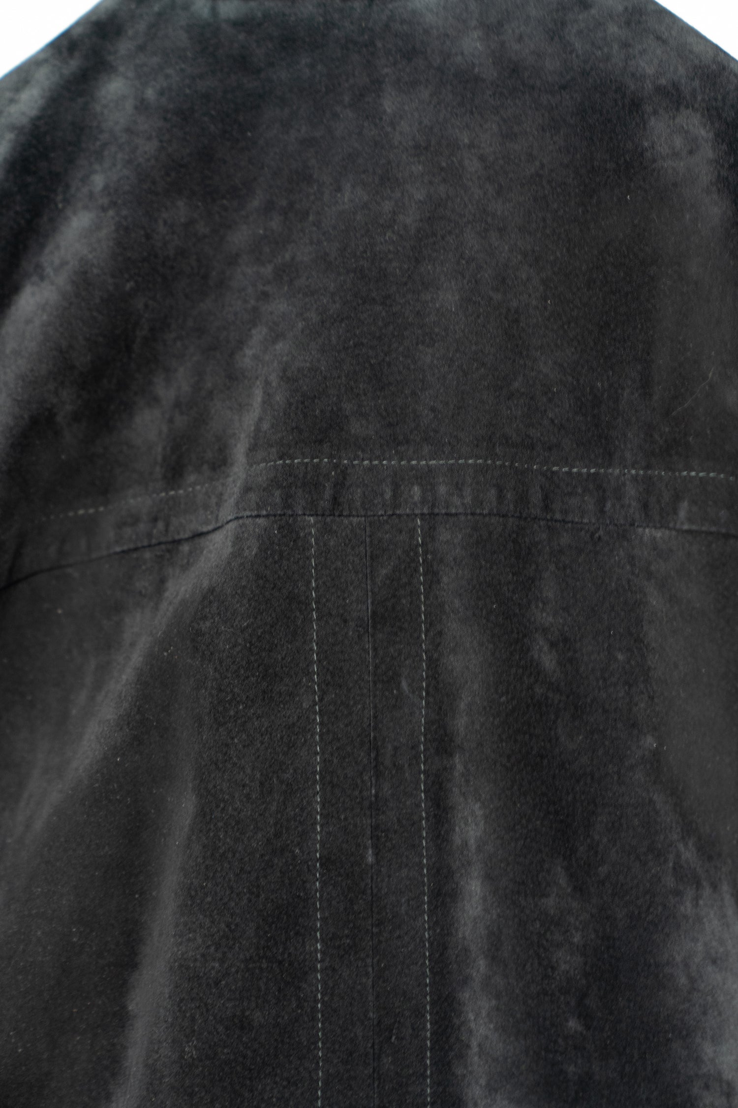 このジャケットは、エルメスが誇るレザーワークの真髄を体現する一着です。素材には、ラグジュアリーブランドの中でもほとんど用いられることのない「ピッグスキン(豚革)」を採用。上質な素材ながら非常に扱いが難しいことで知られ、熟練した職人の手でしか仕立てられない特別なレザーです。表面を丁寧にスウェード調へと仕上げることで、深いマットブラックの質感が生まれ、光を受ける角度でわずかに艶を帯びる独特の陰影が現れます。まさに、使い込むほどにその表情を変えていく「育つ革」。HERMÈS が長年培ってきた素材哲学が息づいています。